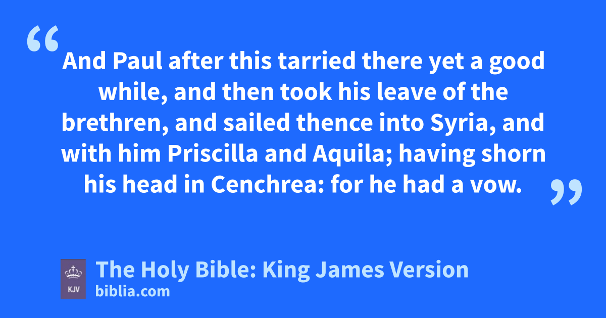 18 And Paul after this tarried there yet a good while, and then took his leave of the brethren, and sailed thence into Syria, and with him Priscilla and Aquila; having shorn his head in Cenchrea: for he had a vow. 19 And he came to Ephesus, and left them there: but he himself entered into the synagogue, and reasoned with the Jews. 20 When they desired him to tarry longer time with them, he consented not; 21 But bade them farewell, saying, I must by all means keep this feast that cometh in Jerusalem: but I will return again unto you, if God will. And he sailed from Ephesus. 22 And when he had landed at Caesarea, and gone up, and saluted the church, he went down to Antioch. 23 And after he had spent some time there, he departed, and went over all the country of Galatia and Phrygia in order, strengthening all the disciples.