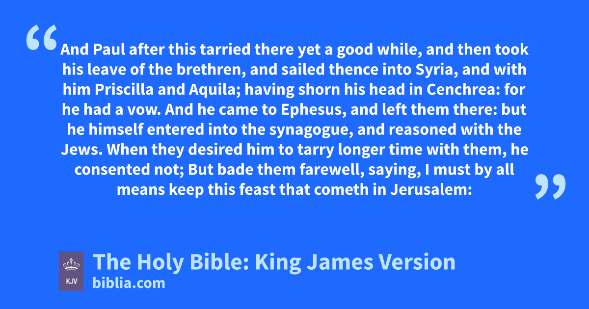 18 And Paul after this tarried there yet a good while, and then took his leave of the brethren, and sailed thence into Syria, and with him Priscilla and Aquila; having shorn his head in Cenchrea: for he had a vow. 19 And he came to Ephesus, and left them there: but he himself entered into the synagogue, and reasoned with the Jews. 20 When they desired him to tarry longer time with them, he consented not; 21 But bade them farewell, saying, I must by all means keep this feast that cometh in Jerusalem: but I will return again unto you, if God will. And he sailed from Ephesus. 22 And when he had landed at Caesarea, and gone up, and saluted the church, he went down to Antioch. 23 And after he had spent some time there, he departed, and went over all the country of Galatia and Phrygia in order, strengthening all the disciples.