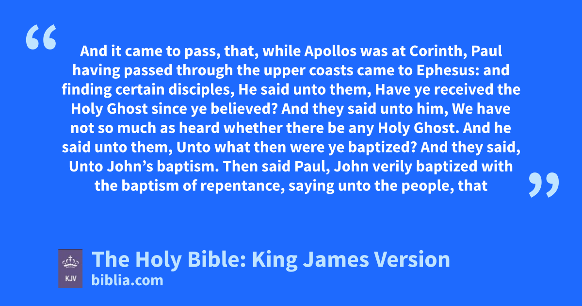 1 And it came to pass, that, while Apollos was at Corinth, Paul having passed through the upper coasts came to Ephesus: and finding certain disciples, 2 He said unto them, Have ye received the Holy Ghost since ye believed? And they said unto him, We have not so much as heard whether there be any Holy Ghost. 3 And he said unto them, Unto what then were ye baptized? And they said, Unto John’s baptism. 4 Then said Paul, John verily baptized with the baptism of repentance, saying unto the people, that they should believe on him which should come after him, that is, on Christ Jesus. 5 When they heard this, they were baptized in the name of the Lord Jesus. 6 And when Paul had laid his hands upon them, the Holy Ghost came on them; and they spake with tongues, and prophesied. 7 And all the men were about twelve.