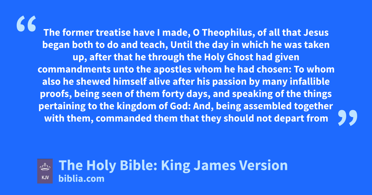 1 The former treatise have I made, O Theophilus, of all that Jesus began both to do and teach, 2 Until the day in which he was taken up, after that he through the Holy Ghost had given commandments unto the apostles whom he had chosen: 3 To whom also he shewed himself alive after his passion by many infallible proofs, being seen of them forty days, and speaking of the things pertaining to the kingdom of God: 4 And, being assembled together with them, commanded them that they should not depart from Jerusalem, but wait for the promise of the Father, which, saith he, ye have heard of me. 5 For John truly baptized with water; but ye shall be baptized with the Holy Ghost not many days hence.