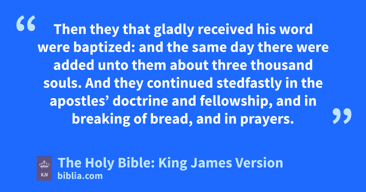 42 And they continued stedfastly in the apostles’ doctrine and fellowship, and in breaking of bread, and in prayers. 43 And fear came upon every soul: and many wonders and signs were done by the apostles. 44 And all that believed were together, and had all things common; 45 And sold their possessions and goods, and parted them to all men, as every man had need. 46 And they, continuing daily with one accord in the temple, and breaking bread fromc house to house, did eat their meat with gladness and singleness of heart, 47 Praising God, and having favour with all the people. And the Lord added to the church daily such as should be saved.