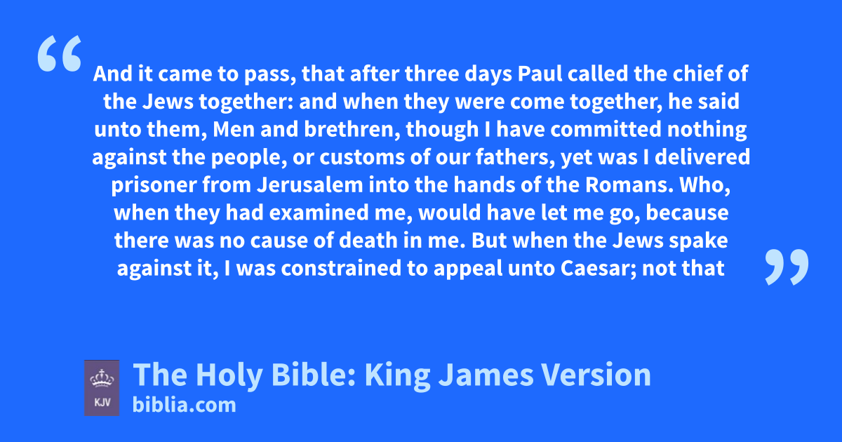 17 And it came to pass, that after three days Paul called the chief of the Jews together: and when they were come together, he said unto them, Men and brethren, though I have committed nothing against the people, or customs of our fathers, yet was I delivered prisoner from Jerusalem into the hands of the Romans. 18 Who, when they had examined me, would have let me go, because there was no cause of death in me. 19 But when the Jews spake against it, I was constrained to appeal unto Caesar; not that I had ought to accuse my nation of. 20 For this cause therefore have I called for you, to see you, and to speak with you: because that for the hope of Israel I am bound with this chain. 21 And they said unto him, We neither received letters out of Judaea concerning thee, neither any of the brethren that came shewed or spake any harm of thee. 22 But we desire to hear of thee what thou thinkest: for as concerning this sect, we know that every where it is spoken against.