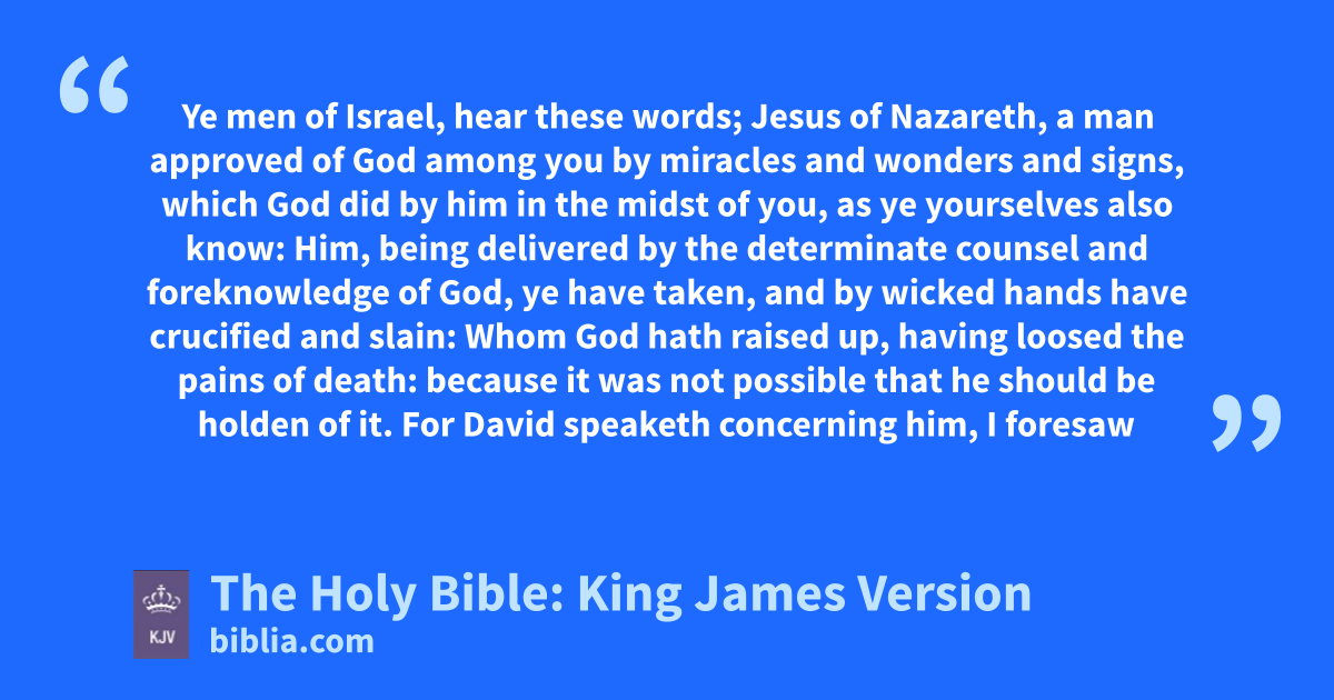 14 But Peter, standing up with the eleven, lifted up his voice, and said unto them, Ye men of Judaea, and all ye that dwell at Jerusalem, be this known unto you, and hearken to my words: 15 For these are not drunken, as ye suppose, seeing it is but the third hour of the day. 16 But this is that which was spoken by the prophet Joel; 17 And it shall come to pass in the last days, saith God, I will pour out of my Spirit upon all flesh: and your sons and your daughters shall prophesy, and your young men shall see visions, and your old men shall dream dreams: 18 And on my servants and on my handmaidens I will pour out in those days of my Spirit; and they shall prophesy: 19 And I will shew wonders in heaven above, and signs in the earth beneath; blood, and fire, and vapour of smoke: 20 The sun shall be turned into darkness, and the moon into blood, before that great and notable day of the Lord come: 21 And it shall come to pass, that whosoever shall call on the name of the Lord shall be saved. 22 Ye men of Israel, hear these words; Jesus of Nazareth, a man approved of God among you by miracles and wonders and signs, which God did by him in the midst of you, as ye yourselves also know: 23 Him, being delivered by the determinate counsel and foreknowledge of God, ye have taken, and by wicked hands have crucified and slain: 24 Whom God hath raised up, having loosed the pains of death: because it was not possible that he should be holden of it. 25 For David speaketh concerning him, I foresaw the Lord always before my face, for he is on my right hand, that I should not be moved: 26 Therefore did my heart rejoice, and my tongue was glad; moreover also my flesh shall rest in hope: 27 Because thou wilt not leave my soul in hell, neither wilt thou suffer thine Holy One to see corruption. 28 Thou hast made known to me the ways of life; thou shalt make me full of joy with thy countenance. 29 Men and brethren, let meb freely speak unto you of the patriarch David, that he is both dead and buried, and his sepulchre is with us unto this day. 30 Therefore being a prophet, and knowing that God had sworn with an oath to him, that of the fruit of his loins, according to the flesh, he would raise up Christ to sit on his throne; 31 He seeing this before spake of the resurrection of Christ, that his soul was not left in hell, neither his flesh did see corruption. 32 This Jesus hath God raised up, whereof we all are witnesses. 33 Therefore being by the right hand of God exalted, and having received of the Father the promise of the Holy Ghost, he hath shed forth this, which ye now see and hear. 34 For David is not ascended into the heavens: but he saith himself, The LORD said unto my Lord, Sit thou on my right hand, 35 Until I make thy foes thy footstool. 36 Therefore let all the house of Israel know assuredly, that God hath made that same Jesus, whom ye have crucified, both Lord and Christ.