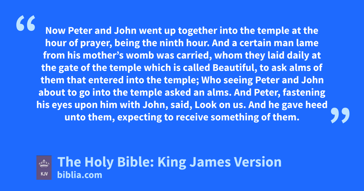 1 Now Peter and John went up together into the temple at the hour of prayer, being the ninth hour. 2 And a certain man lame from his mother’s womb was carried, whom they laid daily at the gate of the temple which is called Beautiful, to ask alms of them that entered into the temple; 3 Who seeing Peter and John about to go into the temple asked an alms. 4 And Peter, fastening his eyes upon him with John, said, Look on us. 5 And he gave heed unto them, expecting to receive something of them. 6 Then Peter said, Silver and gold have I none; but such as I have give I thee: In the name of Jesus Christ of Nazareth rise up and walk. 7 And he took him by the right hand, and lifted him up: and immediately his feet and ankle bones received strength. 8 And he leaping up stood, and walked, and entered with them into the temple, walking, and leaping, and praising God. 9 And all the people saw him walking and praising God: 10 And they knew that it was he which sat for alms at the Beautiful gate of the temple: and they were filled with wonder and amazement at that which had happened unto him. 11 And as the lame man which was healed held Peter and John, all the people ran together unto them in the porch that is called Solomon’s, greatly wondering.