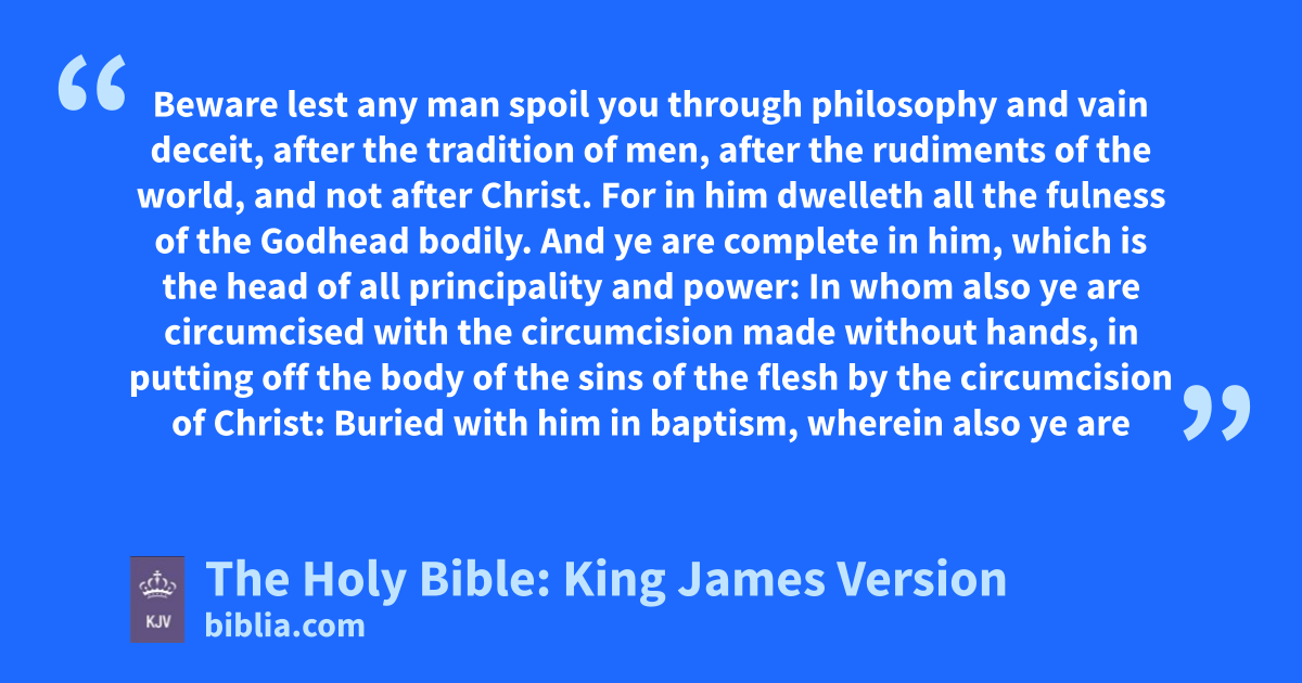 4 And this I say, lest any man should beguile you with enticing words. 5 For though I be absent in the flesh, yet am I with you in the spirit, joying and beholding your order, and the stedfastness of your faith in Christ. 6 As ye have therefore received Christ Jesus the Lord, so walk ye in him: 7 Rooted and built up in him, and stablished in the faith, as ye have been taught, abounding therein with thanksgiving. 8 Beware lest any man spoil you through philosophy and vain deceit, after the tradition of men, after the rudimentsc of the world, and not after Christ. 9 For in him dwelleth all the fulness of the Godhead bodily. 10 And ye are complete in him, which is the head of all principality and power: 11 In whom also ye are circumcised with the circumcision made without hands, in putting off the body of the sins of the flesh by the circumcision of Christ: 12 Buried with him in baptism, wherein also ye are risen with him through the faith of the operation of God, who hath raised him from the dead.
