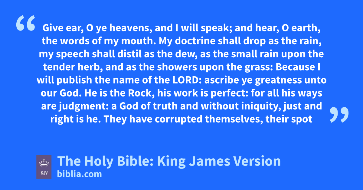 1 Give ear, O ye heavens, and I will speak; and hear, O earth, the words of my mouth. 2 My doctrine shall drop as the rain, my speech shall distil as the dew, as the small rain upon the tender herb, and as the showers upon the grass: 3 Because I will publish the name of the LORD: ascribe ye greatness unto our God. 4 He is the Rock, his work is perfect: for all his ways are judgment: a God of truth and without iniquity, just and right is he. 5 They have corrupted themselves, their spot is not the spot of his children: they are a perverse and crooked generation. 6 Do ye thus requite the LORD, O foolish people and unwise? is not he thy father that hath bought thee? hath he not made thee, and established thee?