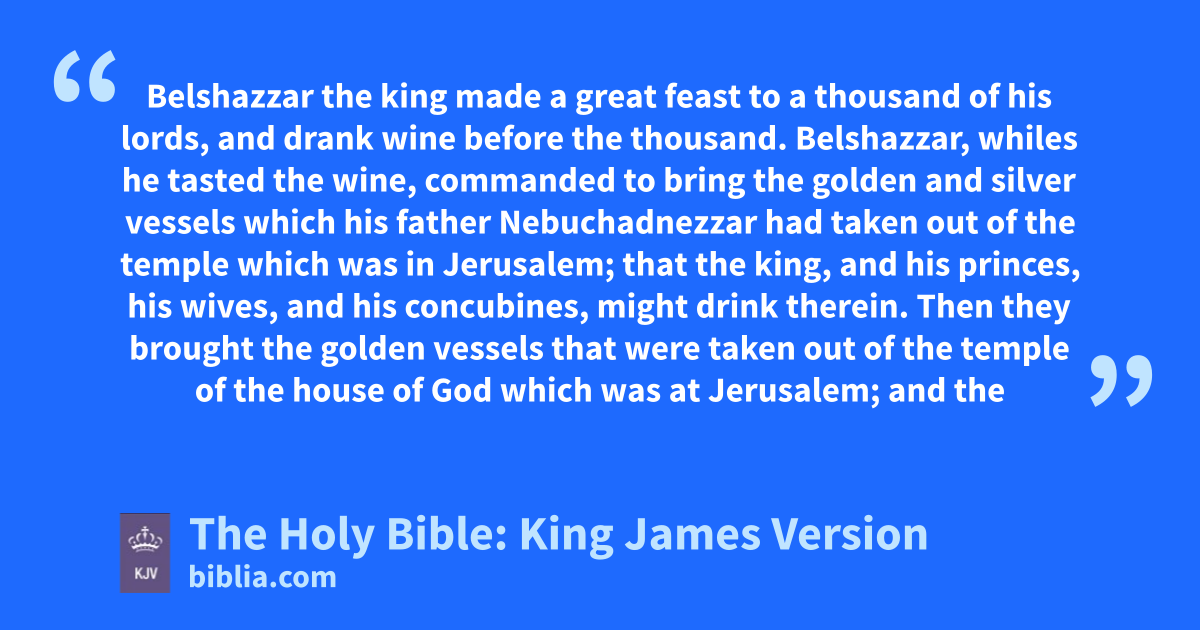 1 Belshazzar the king made a great feast to a thousand of his lords, and drank wine before the thousand. 2 Belshazzar, whiles he tasted the wine, commanded to bring the golden and silver vessels which his fathera Nebuchadnezzar had taken out of the temple which was in Jerusalem; that the king, and his princes, his wives, and his concubines, might drink therein. 3 Then they brought the golden vessels that were taken out of the temple of the house of God which was at Jerusalem; and the king, and his princes, his wives, and his concubines, drank in them. 4 They drank wine, and praised the gods of gold, and of silver, of brass, of iron, of wood, and of stone. 5 In the same hour came forth fingers of a man’s hand, and wrote over against the candlestick upon the plaister of the wall of the king’s palace: and the king saw the part of the hand that wrote. 6 Then the king’s countenanceb was changed, and his thoughts troubled him, so that the joints of his loins were loosed, and his knees smote one against another. 7 The king cried aloudc to bring in the astrologers, the Chaldeans, and the soothsayers. And the king spake, and said to the wise men of Babylon, Whosoever shall read this writing, and shew me the interpretation thereof, shall be clothed with scarlet, and have a chain of gold about his neck, and shall be the third ruler in the kingdom. 8 Then came in all the king’s wise men: but they could not read the writing, nor make known to the king the interpretation thereof. 9 Then was king Belshazzar greatly troubled, and his countenanced was changed in him, and his lords were astonied.
