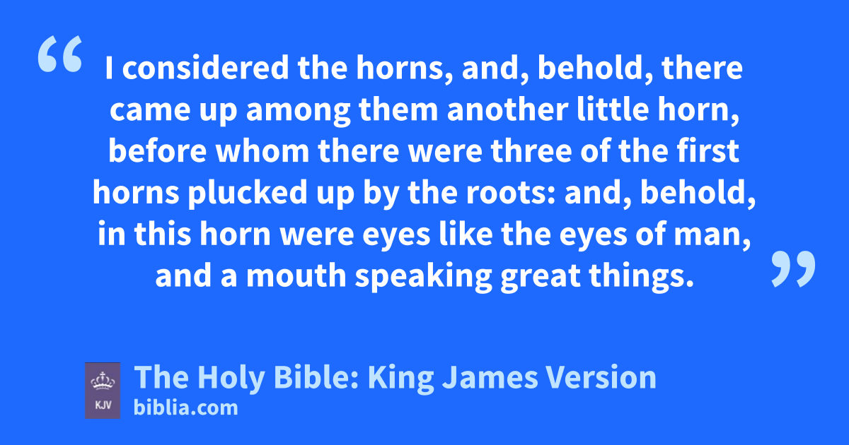 1 In the first year of Belshazzar king of Babylon Daniel hada a dream and visions of his head upon his bed: then he wrote the dream, and told the sum of the matters. 2 Daniel spake and said, I saw in my vision by night, and, behold, the four winds of the heaven strove upon the great sea. 3 And four great beasts came up from the sea, diverse one from another. 4 The first was like a lion, and had eagle’s wings: I beheld till the wings thereof were plucked, and it was lifted up from the earth, and made stand upon the feet as a man, and a man’s heart was given to it. 5 And behold another beast, a second, like to a bear, and it raised up itself on one side, and it had three ribs in the mouth of it between the teeth of it: and they said thus unto it, Arise, devour much flesh. 6 After this I beheld, and lo another, like a leopard, which had upon the back of it four wings of a fowl; the beast had also four heads; and dominion was given to it. 7 After this I saw in the night visions, and behold a fourth beast, dreadful and terrible, and strong exceedingly; and it had great iron teeth: it devoured and brake in pieces, and stamped the residue with the feet of it: and it was diverse from all the beasts that were before it; and it had ten horns. 8 I considered the horns, and, behold, there came up among them another little horn, before whom there were three of the first horns plucked up by the roots: and, behold, in this horn were eyes like the eyes of man, and a mouth speaking great things.