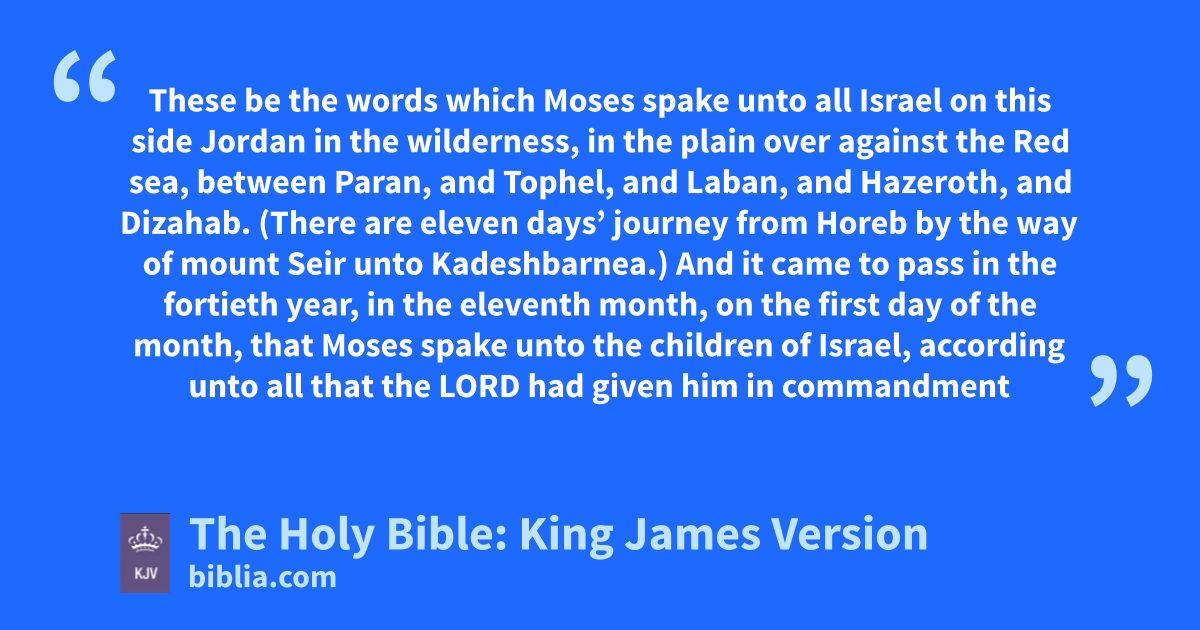 1 These be the words which Moses spake unto all Israel on this side Jordan in the wilderness, in the plain over against the Reda sea, between Paran, and Tophel, and Laban, and Hazeroth, and Dizahab. 2 (There are eleven days’ journey from Horeb by the way of mount Seir unto Kadeshbarnea.) 3 And it came to pass in the fortieth year, in the eleventh month, on the first day of the month, that Moses spake unto the children of Israel, according unto all that the LORD had given him in commandment unto them; 4 After he had slain Sihon the king of the Amorites, which dwelt in Heshbon, and Og the king of Bashan, which dwelt at Astaroth in Edrei: 5 On this side Jordan, in the land of Moab, began Moses to declare this law, saying, 6 The LORD our God spake unto us in Horeb, saying, Ye have dwelt long enough in this mount: 7 Turn you, and take your journey, and go to the mount of the Amorites, and unto all the places nighb thereunto, in the plain, in the hills, and in the vale, and in the south, and by the sea side, to the land of the Canaanites, and unto Lebanon, unto the great river, the river Euphrates. 8 Behold, I have setc the land before you: go in and possess the land which the LORD sware unto your fathers, Abraham, Isaac, and Jacob, to give unto them and to their seed after them.