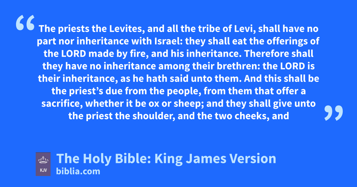 1 The priests the Levites, and all the tribe of Levi, shall have no part nor inheritance with Israel: they shall eat the offerings of the LORD made by fire, and his inheritance. 2 Therefore shall they have no inheritance among their brethren: the LORD is their inheritance, as he hath said unto them. 3 And this shall be the priest’s due from the people, from them that offer a sacrifice, whether it be ox or sheep; and they shall give unto the priest the shoulder, and the two cheeks, and the maw. 4 The firstfruit also of thy corn, of thy wine, and of thine oil, and the first of the fleece of thy sheep, shalt thou give him. 5 For the LORD thy God hath chosen him out of all thy tribes, to stand to minister in the name of the LORD, him and his sons for ever. 6 And if a Levite come from any of thy gates out of all Israel, where he sojourned, and come with all the desire of his mind unto the place which the LORD shall choose; 7 Then he shall minister in the name of the LORD his God, as all his brethren the Levites do, which stand there before the LORD. 8 They shall have like portions to eat, beside that which cometh of the sale of his patrimony.