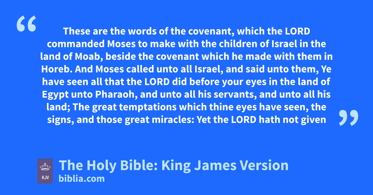 1 These are the words of the covenant, which the LORD commanded Moses to make with the children of Israel in the land of Moab, beside the covenant which he made with them in Horeb. 2 And Moses called unto all Israel, and said unto them, Ye have seen all that the LORD did before your eyes in the land of Egypt unto Pharaoh, and unto all his servants, and unto all his land; 3 The great temptations which thine eyes have seen, the signs, and those great miracles: 4 Yet the LORD hath not given you an heart to perceive, and eyes to see, and ears to hear, unto this day. 5 And I have led you forty years in the wilderness: your clothes are not waxen old upon you, and thy shoe is not waxen old upon thy foot. 6 Ye have not eaten bread, neither have ye drunk wine or strong drink: that ye might know that I am the LORD your God. 7 And when ye came unto this place, Sihon the king of Heshbon, and Og the king of Bashan, came out against us unto battle, and we smote them: 8 And we took their land, and gave it for an inheritance unto the Reubenites, and to the Gadites, and to the half tribe of Manasseh. 9 Keep therefore the words of this covenant, and do them, that ye may prosper in all that ye do.