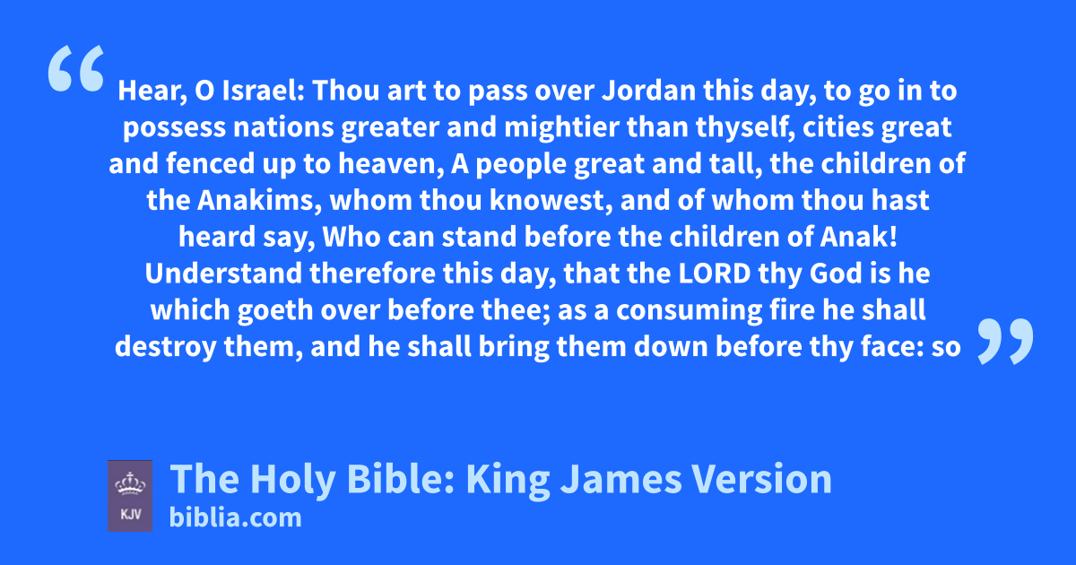 1 Hear, O Israel: Thou art to pass over Jordan this day, to go in to possess nations greater and mightier than thyself, cities great and fenced up to heaven, 2 A people great and tall, the children of the Anakims, whom thou knowest, and of whom thou hast heard say, Who can stand before the children of Anak! 3 Understand therefore this day, that the LORD thy God is he which goeth over before thee; as a consuming fire he shall destroy them, and he shall bring them down before thy face: so shalt thou drive them out, and destroy them quickly, as the LORD hath said unto thee. 4 Speak not thou in thine heart, after that the LORD thy God hath cast them out from before thee, saying, For my righteousness the LORD hath brought me in to possess this land: but for the wickedness of these nations the LORD doth drive them out from before thee. 5 Not for thy righteousness, or for the uprightness of thine heart, dost thou go to possess their land: but for the wickedness of these nations the LORD thy God doth drive them out from before thee, and that he may perform the word which the LORD sware unto thy fathers, Abraham, Isaac, and Jacob. 6 Understand therefore, that the LORD thy God giveth thee not this good land to possess it for thy righteousness; for thou art a stiffnecked people.
