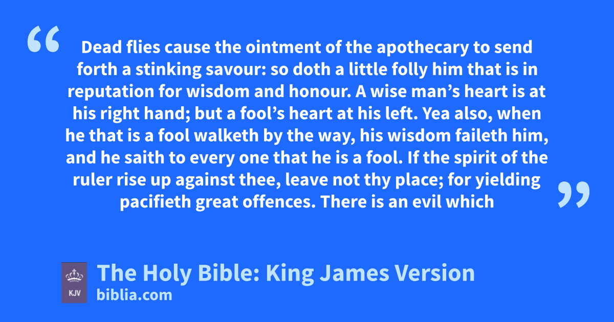 1 Deada flies cause the ointment of the apothecary to send forth a stinking savour: so doth a little folly him that is in reputation for wisdom and honour. 2 A wise man’s heart is at his right hand; but a fool’s heart at his left. 3 Yea also, when he that is a fool walketh by the way, his wisdom faileth him, and he saith to every one that he is a fool.