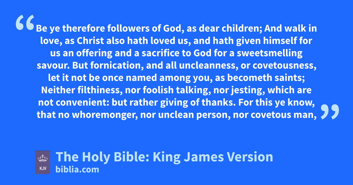 3 But fornication, and all uncleanness, or covetousness, let it not be once named among you, as becometh saints; 4 Neither filthiness, nor foolish talking, nor jesting, which are not convenient: but rather giving of thanks. 5 For this ye know, that no whoremonger, nor unclean person, nor covetous man, who is an idolater, hath any inheritance in the kingdom of Christ and of God. 6 Let no man deceive you with vain words: for because of these things cometh the wrath of God upon the children of disobediencea. 7 Be not ye therefore partakers with them. 8 For ye were sometimes darkness, but now are ye light in the Lord: walk as children of light: 9 (For the fruit of the Spirit is in all goodness and righteousness and truth;) 10 Proving what is acceptable unto the Lord. 11 And have no fellowship with the unfruitful works of darkness, but rather reprove them. 12 For it is a shame even to speak of those things which are done of them in secret. 13 But all things that are reprovedb are made manifest by the light: for whatsoever doth make manifest is light. 14 Wherefore he saith, Awake thou that sleepest, and arise from the dead, and Christ shall give thee light. 15 See then that ye walk circumspectly, not as fools, but as wise, 16 Redeeming the time, because the days are evil. 17 Wherefore be ye not unwise, but understanding what the will of the Lord is. 18 And be not drunk with wine, wherein is excess; but be filled with the Spirit; 19 Speaking to yourselves in psalms and hymns and spiritual songs, singing and making melody in your heart to the Lord; 20 Giving thanks always for all things unto God and the Father in the name of our Lord Jesus Christ;