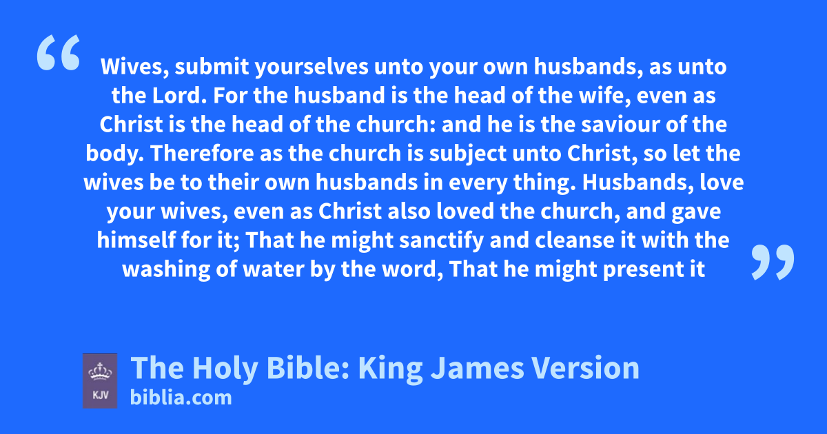 21 Submitting yourselves one to another in the fear of God. 22 Wives, submit yourselves unto your own husbands, as unto the Lord. 23 For the husband is the head of the wife, even as Christ is the head of the church: and he is the saviour of the body. 24 Therefore as the church is subject unto Christ, so let the wives be to their own husbands in every thing. 25 Husbands, love your wives, even as Christ also loved the church, and gave himself for it; 26 That he might sanctify and cleanse it with the washing of water by the word, 27 That he might present it to himself a glorious church, not having spot, or wrinkle, or any such thing; but that it should be holy and without blemish. 28 So ought men to love their wives as their own bodies. He that loveth his wife loveth himself. 29 For no man ever yet hated his own flesh; but nourisheth and cherisheth it, even as the Lord the church: 30 For we are members of his body, of his flesh, and of his bones. 31 For this cause shall a man leave his father and mother, and shall be joined unto his wife, and they two shall be one flesh. 32 This is a great mystery: but I speak concerning Christ and the church. 33 Nevertheless let every one of you in particular so love his wife even as himself; and the wife see that she reverence her husband.