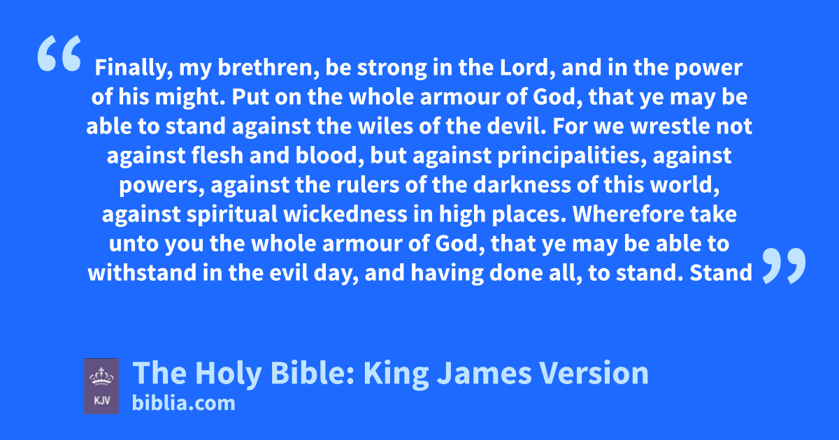 10 Finally, my brethren, be strong in the Lord, and in the power of his might. 11 Put on the whole armour of God, that ye may be able to stand against the wiles of the devil. 12 For we wrestle not against fleshb and blood, but against principalities, against powers, against the rulers of the darkness of this world, against spiritual wickedness in high places. 13 Wherefore take unto you the whole armour of God, that ye may be able to withstand in the evil day, and having done all, to stand. 14 Stand therefore, having your loins girt about with truth, and having on the breastplate of righteousness; 15 And your feet shod with the preparation of the gospel of peace; 16 Above all, taking the shield of faith, wherewith ye shall be able to quench all the fiery darts of the wicked. 17 And take the helmet of salvation, and the sword of the Spirit, which is the word of God: 18 Praying always with all prayer and supplication in the Spirit, and watching thereunto with all perseverance and supplication for all saints;