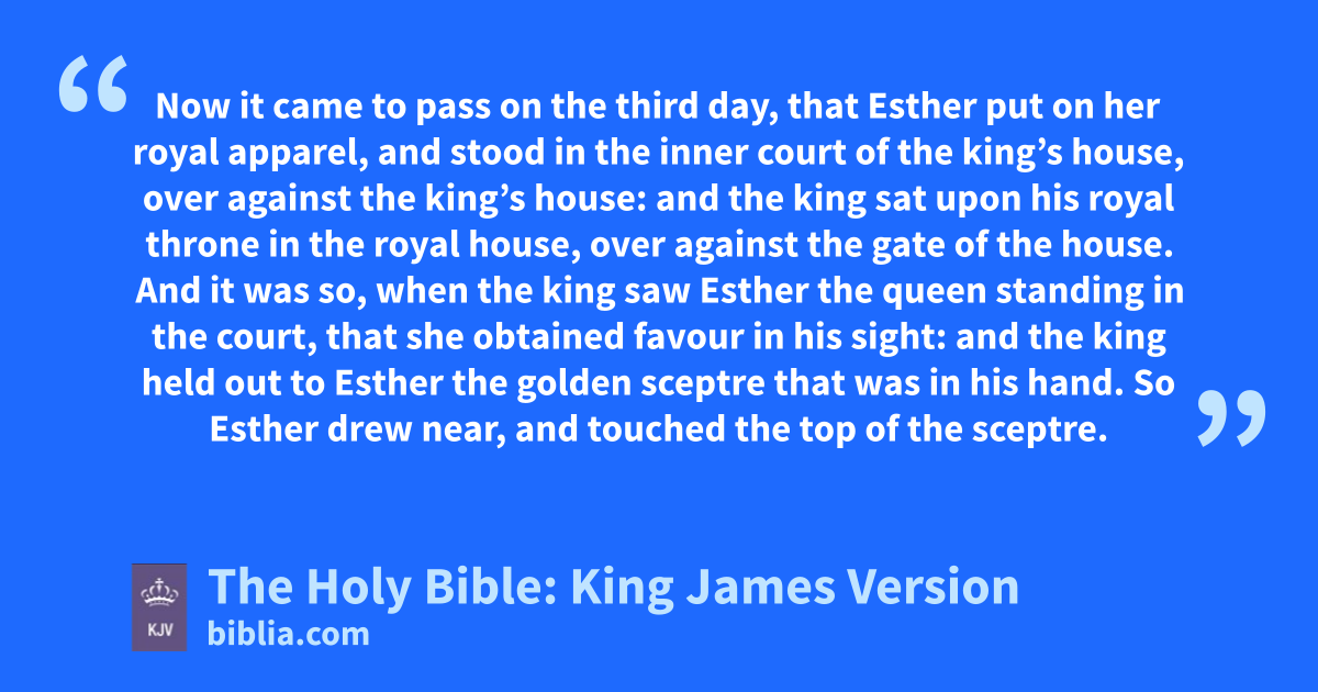 1 Now it came to pass on the third day, that Esther put on her royal apparel, and stood in the inner court of the king’s house, over against the king’s house: and the king sat upon his royal throne in the royal house, over against the gate of the house. 2 And it was so, when the king saw Esther the queen standing in the court, that she obtained favour in his sight: and the king held out to Esther the golden sceptre that was in his hand. So Esther drew near, and touched the top of the sceptre. 3 Then said the king unto her, What wilt thou, queen Esther? and what is thy request? it shall be even given thee to the half of the kingdom. 4 And Esther answered, If it seem good unto the king, let the king and Haman come this day unto the banquet that I have prepared for him. 5 Then the king said, Cause Haman to make haste, that he may do as Esther hath said. So the king and Haman came to the banquet that Esther had prepared. 6 And the king said unto Esther at the banquet of wine, What is thy petition? and it shall be granted thee: and what is thy request? even to the half of the kingdom it shall be performed. 7 Then answered Esther, and said, My petition and my request is; 8 If I have found favour in the sight of the king, and if it please the king to grant my petition, and to performa my request, let the king and Haman come to the banquet that I shall prepare for them, and I will do to morrow as the king hath said.