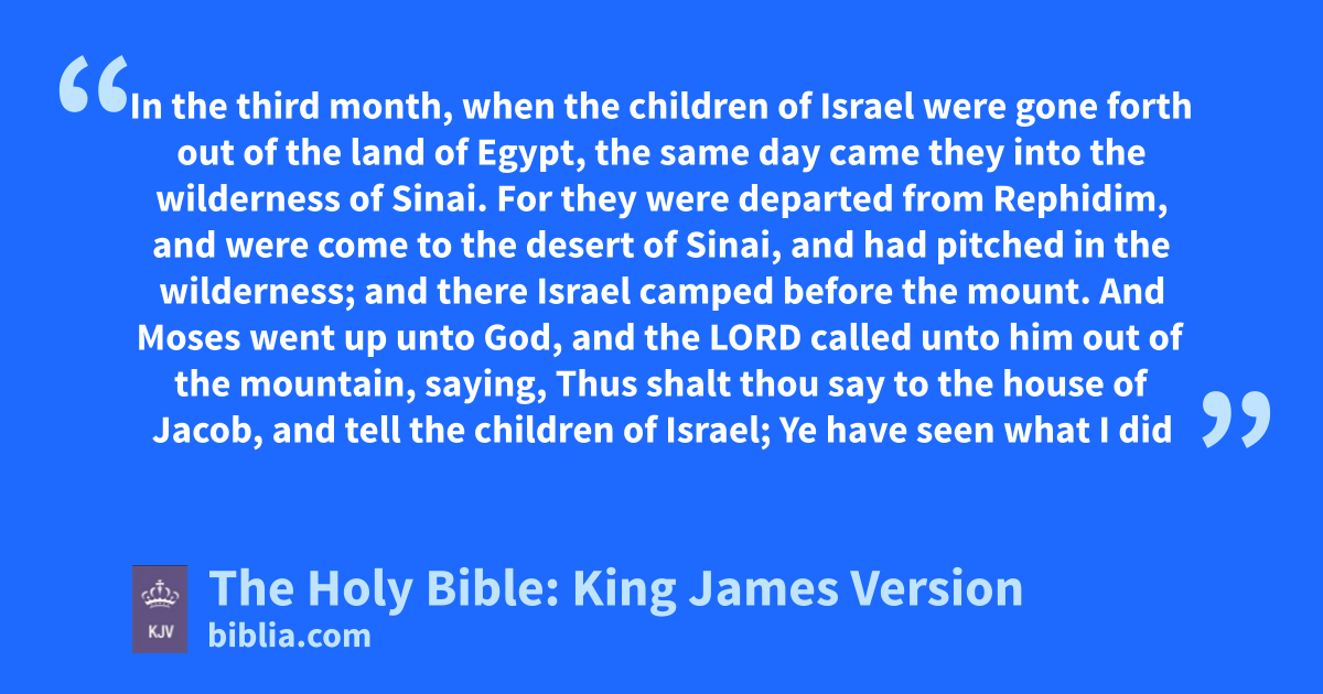 1 In the third month, when the children of Israel were gone forth out of the land of Egypt, the same day came they into the wilderness of Sinai. 2 For they were departed from Rephidim, and were come to the desert of Sinai, and had pitched in the wilderness; and there Israel camped before the mount. 3 And Moses went up unto God, and the LORD called unto him out of the mountain, saying, Thus shalt thou say to the house of Jacob, and tell the children of Israel; 4 Ye have seen what I did unto the Egyptians, and how I bare you on eagles’ wings, and brought you unto myself. 5 Now therefore, if ye will obey my voice indeed, and keep my covenant, then ye shall be a peculiar treasure unto me above all people: for all the earth is mine: 6 And ye shall be unto me a kingdom of priests, and an holy nation. These are the words which thou shalt speak unto the children of Israel. 7 And Moses came and called for the elders of the people, and laid before their faces all these words which the LORD commanded him. 8 And all the people answered together, and said, All that the LORD hath spoken we will do. And Moses returned the words of the people unto the LORD.