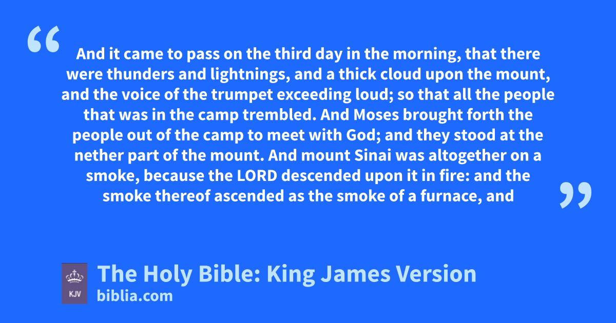 16 And it came to pass on the third day in the morning, that there were thunders and lightnings, and a thick cloud upon the mount, and the voice of the trumpet exceeding loud; so that all the people that was in the camp trembled. 17 And Moses brought forth the people out of the camp to meet with God; and they stood at the nether part of the mount. 18 And mount Sinai was altogether on a smoke, because the LORD descended upon it in fire: and the smoke thereof ascended as the smoke of a furnace, and the whole mount quaked greatly. 19 And when the voice of the trumpet sounded long, and waxed louder and louder, Moses spake, and God answered him by a voice. 20 And the LORD came down upon mount Sinai, on the top of the mount: and the LORD called Moses up to the top of the mount; and Moses went up. 21 And the LORD said unto Moses, Go down, chargeb the people, lest they break through unto the LORD to gaze, and many of them perish. 22 And let the priests also, which come near to the LORD, sanctify themselves, lest the LORD break forth upon them. 23 And Moses said unto the LORD, The people cannot come up to mount Sinai: for thou chargedst us, saying, Set bounds about the mount, and sanctify it. 24 And the LORD said unto him, Away, get thee down, and thou shalt come up, thou, and Aaron with thee: but let not the priests and the people break through to come up unto the LORD, lest he break forth upon them. 25 So Moses went down unto the people, and spake unto them.