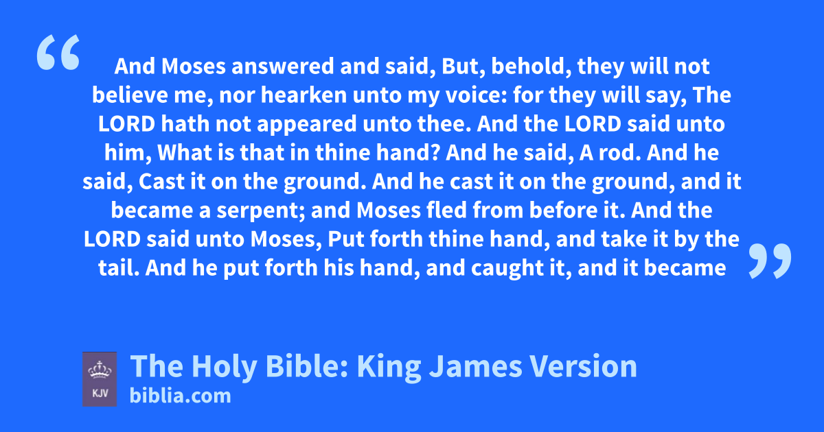 1 And Moses answered and said, But, behold, they will not believe me, nor hearken unto my voice: for they will say, The LORD hath not appeared unto thee. 2 And the LORD said unto him, What is that in thine hand? And he said, A rod. 3 And he said, Cast it on the ground. And he cast it on the ground, and it became a serpent; and Moses fled from before it. 4 And the LORD said unto Moses, Put forth thine hand, and take it by the tail. And he put forth his hand, and caught it, and it became a rod in his hand: 5 That they may believe that the LORD God of their fathers, the God of Abraham, the God of Isaac, and the God of Jacob, hath appeared unto thee. 6 And the LORD said furthermore unto him, Put now thine hand into thy bosom. And he put his hand into his bosom: and when he took it out, behold, his hand was leprous as snow. 7 And he said, Put thine hand into thy bosom again. And he put his hand into his bosom again; and plucked it out of his bosom, and, behold, it was turned again as his other flesh. 8 And it shall come to pass, if they will not believe thee, neither hearken to the voice of the first sign, that they will believe the voice of the latter sign. 9 And it shall come to pass, if they will not believe also these two signs, neither hearken unto thy voice, that thou shalt take of the water of the river, and pour it upon the dry land: and the water which thou takest out of the river shall become blood upon the dry land.