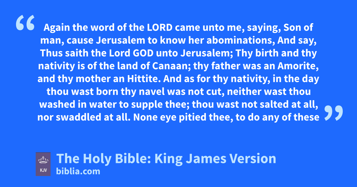 1 Again the word of the LORD came unto me, saying, 2 Son of man, cause Jerusalem to know her abominations, 3 And say, Thus saith the Lord GOD unto Jerusalem; Thy birtha and thy nativity is of the land of Canaan; thy father was an Amorite, and thy mother an Hittite. 4 And as for thy nativity, in the day thou wast born thy navel was not cut, neither wast thou washed in water to suppleb thee; thou wast not salted at all, nor swaddled at all. 5 None eye pitied thee, to do any of these unto thee, to have compassion upon thee; but thou wast cast out in the open field, to the lothing of thy person, in the day that thou wast born.