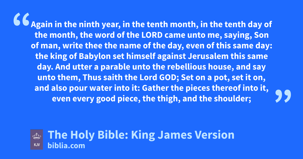 1 Again in the ninth year, in the tenth month, in the tenth day of the month, the word of the LORD came unto me, saying, 2 Son of man, write thee the name of the day, even of this same day: the king of Babylon set himself against Jerusalem this same day. 3 And utter a parable unto the rebellious house, and say unto them, Thus saith the Lord GOD; Set on a pot, set it on, and also pour water into it: 4 Gather the pieces thereof into it, even every good piece, the thigh, and the shoulder; fill it with the choice bones. 5 Take the choice of the flock, and burna also the bones under it, and make it boil well, and let them seethe the bones of it therein. 6 Wherefore thus saith the Lord GOD; Woe to the bloody city, to the pot whose scum is therein, and whose scum is not gone out of it! bring it out piece by piece; let no lot fall upon it. 7 For her blood is in the midst of her; she set it upon the top of a rock; she poured it not upon the ground, to cover it with dust; 8 That it might cause fury to come up to take vengeance; I have set her blood upon the top of a rock, that it should not be covered. 9 Therefore thus saith the Lord GOD; Woe to the bloody city! I will even make the pile for fire great. 10 Heap on wood, kindle the fire, consume the flesh, and spice it well, and let the bones be burned. 11 Then set it empty upon the coals thereof, that the brass of it may be hot, and may burn, and that the filthiness of it may be molten in it, that the scum of it may be consumed. 12 She hath wearied herself with lies, and her great scum went not forth out of her: her scum shall be in the fire. 13 In thy filthiness is lewdness: because I have purged thee, and thou wast not purged, thou shalt not be purged from thy filthiness any more, till I have caused my fury to rest upon thee. 14 I the LORD have spoken it: it shall come to pass, and I will do it; I will not go back, neither will I spare, neither will I repent; according to thy ways, and according to thy doings, shall they judge thee, saith the Lord GOD.