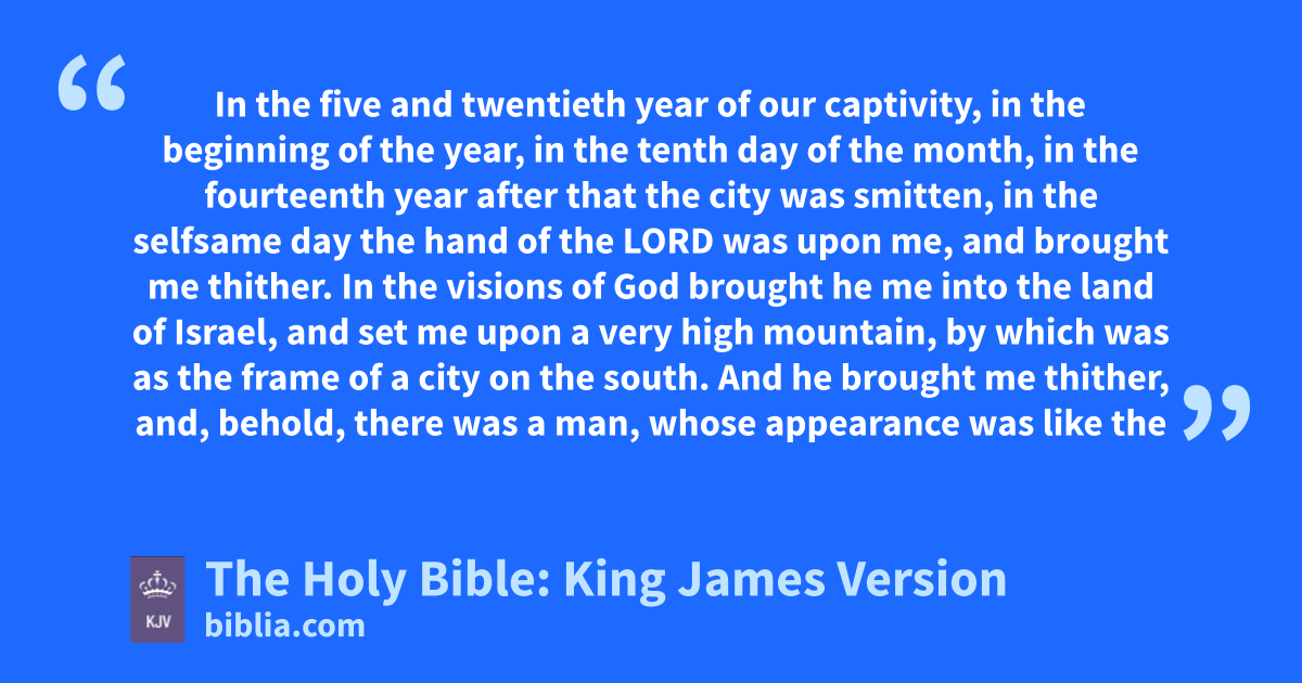 1 In the five and twentieth year of our captivity, in the beginning of the year, in the tenth day of the month, in the fourteenth year after that the city was smitten, in the selfsame day the hand of the LORD was upon me, and brought me thither. 2 In the visions of God brought he me into the land of Israel, and set me upon a very high mountain, by which was as the framea of a city on the south. 3 And he brought me thither, and, behold, there was a man, whose appearance was like the appearance of brass, with a line of flax in his hand, and a measuring reed; and he stood in the gate. 4 And the man said unto me, Son of man, behold with thine eyes, and hear with thine ears, and set thine heart upon all that I shall shew thee; for to the intent that I might shew them unto thee art thou brought hither: declare all that thou seest to the house of Israel.