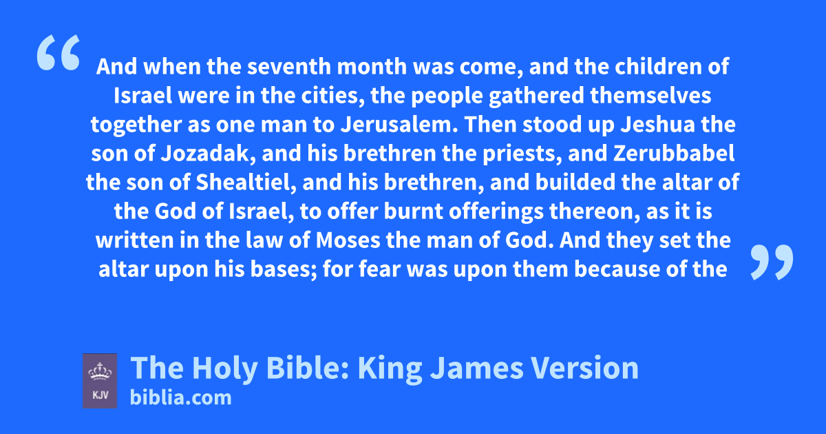 1 And when the seventh month was come, and the children of Israel were in the cities, the people gathered themselves together as one man to Jerusalem. 2 Then stood up Jeshuaa the son of Jozadak, and his brethren the priests, and Zerubbabel the son of Shealtiel, and his brethren, and builded the altar of the God of Israel, to offer burnt offerings thereon, as it is written in the law of Moses the man of God. 3 And they set the altar upon his bases; for fear was upon them because of the people of those countries: and they offered burnt offerings thereon unto the LORD, even burnt offerings morning and evening. 4 They kept also the feast of tabernacles, as it is written, and offered the daily burnt offerings by number, according to the custom, as the dutyb of every day required; 5 And afterward offered the continual burnt offering, both of the new moons, and of all the set feasts of the LORD that were consecrated, and of every one that willingly offered a freewill offering unto the LORD. 6 From the first day of the seventh month began they to offer burnt offerings unto the LORD. But the foundationc of the temple of the LORD was not yet laid. 7 They gave money also unto the masons, and to the carpentersd; and meat, and drink, and oil, unto them of Zidon, and to them of Tyre, to bring cedar trees from Lebanon to the sea of Joppa, according to the grant that they had of Cyrus king of Persia.