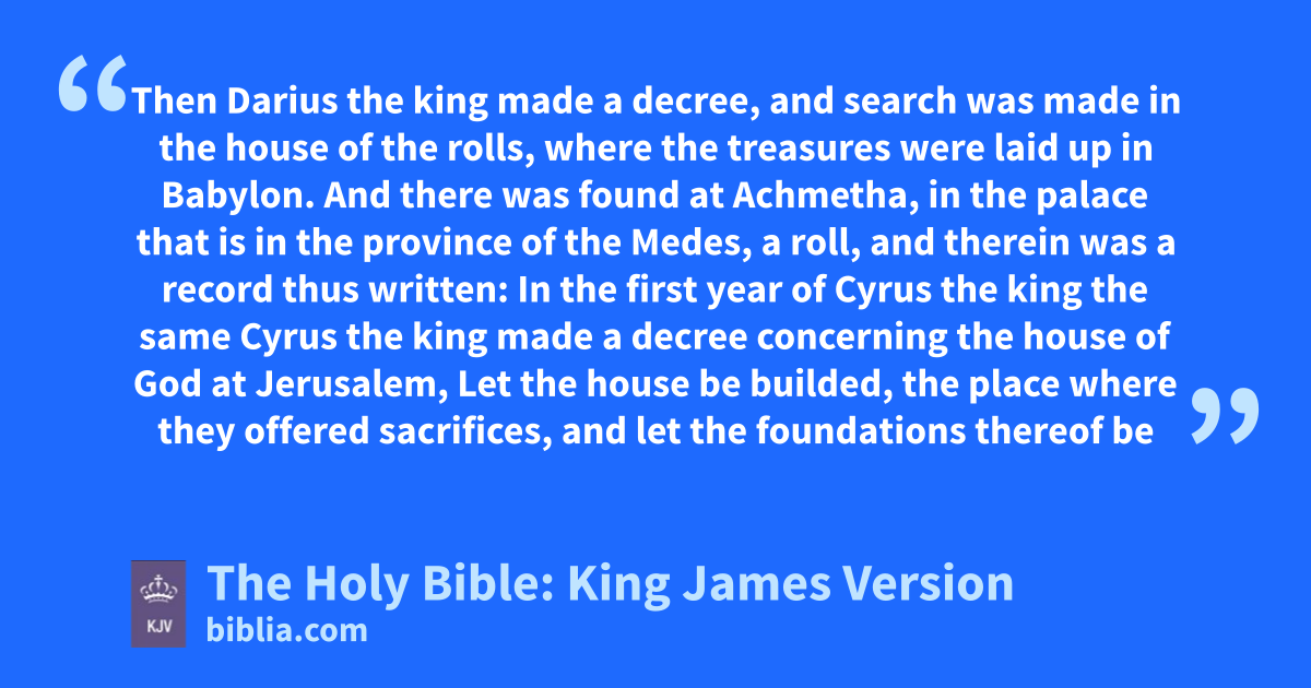 1 Then Darius the king made a decree, and search was made in the house of the rollsa, where the treasures were laid up in Babylon. 2 And there was found at Achmethab, in the palace that is in the province of the Medes, a roll, and therein was a record thus written: 3 In the first year of Cyrus the king the same Cyrus the king made a decree concerning the house of God at Jerusalem, Let the house be builded, the place where they offered sacrifices, and let the foundations thereof be strongly laid; the height thereof threescore cubits, and the breadth thereof threescore cubits; 4 With three rows of great stones, and a row of new timber: and let the expenses be given out of the king’s house: 5 And also let the golden and silver vessels of the house of God, which Nebuchadnezzar took forth out of the temple which is at Jerusalem, and brought unto Babylon, be restored, and brought againc unto the temple which is at Jerusalem, every one to his place, and place them in the house of God. 6 Now therefore, Tatnai, governor beyond the river, Shetharboznai, and your companions the Apharsachites, which are beyond the river, be ye far from thence: 7 Let the work of this house of God alone; let the governor of the Jews and the elders of the Jews build this house of God in his place. 8 Moreover I maked a decree what ye shall do to the elders of these Jews for the building of this house of God: that of the king’s goods, even of the tribute beyond the river, forthwith expenses be given unto these men, that they be not hindered. 9 And that which they have need of, both young bullocks, and rams, and lambs, for the burnt offerings of the God of heaven, wheat, salt, wine, and oil, according to the appointment of the priests which are at Jerusalem, let it be given them day by day without fail: 10 That they may offer sacrifices of sweet savours unto the God of heaven, and pray for the life of the king, and of his sons. 11 Also I have made a decree, that whosoever shall alter this word, let timber be pulled down from his house, and being set up, let him be hanged thereon; and let his house be made a dunghill for this. 12 And the God that hath caused his name to dwell there destroy all kings and people, that shall put to their hand to alter and to destroy this house of God which is at Jerusalem. I Darius have made a decree; let it be done with speed.