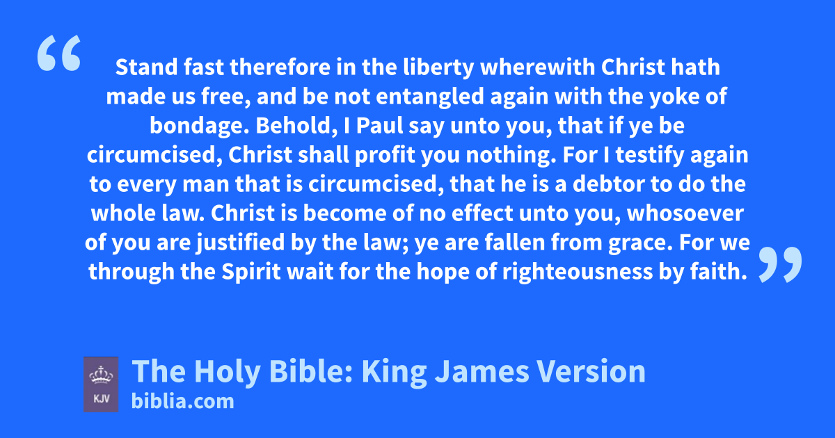 1 Stand fast therefore in the liberty wherewith Christ hath made us free, and be not entangled again with the yoke of bondage. 2 Behold, I Paul say unto you, that if ye be circumcised, Christ shall profit you nothing. 3 For I testify again to every man that is circumcised, that he is a debtor to do the whole law. 4 Christ is become of no effect unto you, whosoever of you are justified by the law; ye are fallen from grace. 5 For we through the Spirit wait for the hope of righteousness by faith. 6 For in Jesus Christ neither circumcision availeth any thing, nor uncircumcision; but faith which worketh by love. 7 Ye did run well; who did hinder youa that ye should not obey the truth? 8 This persuasion cometh not of him that calleth you. 9 A little leaven leaveneth the whole lump. 10 I have confidence in you through the Lord, that ye will be none otherwise minded: but he that troubleth you shall bear his judgment, whosoever he be. 11 And I, brethren, if I yet preach circumcision, why do I yet suffer persecution? then is the offence of the cross ceased. 12 I would they were even cut off which trouble you.