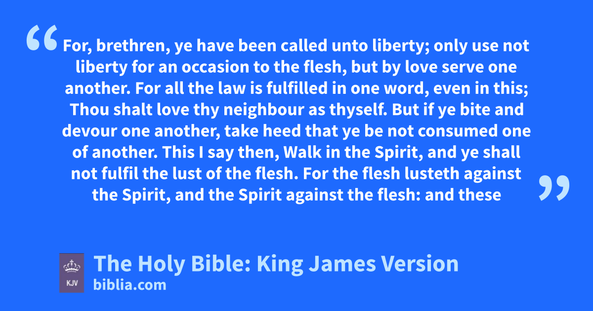 13 For, brethren, ye have been called unto liberty; only use not liberty for an occasion to the flesh, but by love serve one another. 14 For all the law is fulfilled in one word, even in this; Thou shalt love thy neighbour as thyself. 15 But if ye bite and devour one another, take heed that ye be not consumed one of another. 16 This I say then, Walk in the Spirit, and ye shall not fulfil the lust of the flesh. 17 For the flesh lusteth against the Spirit, and the Spirit against the flesh: and these are contrary the one to the other: so that ye cannot do the things that ye would. 18 But if ye be led of the Spirit, ye are not under the law. 19 Now the works of the flesh are manifest, which are these; Adultery, fornication, uncleanness, lasciviousness, 20 Idolatry, witchcraft, hatred, variance, emulations, wrath, strife, seditions, heresies, 21 Envyings, murders, drunkenness, revellings, and such like: of the which I tell you before, as I have also told you in time past, that they which do such things shall not inherit the kingdom of God. 22 But the fruit of the Spirit is love, joy, peace, longsuffering, gentleness, goodness, faith, 23 Meekness, temperance: against such there is no law. 24 And they that are Christ’s have crucified the flesh with the affectionsb and lusts. 25 If we live in the Spirit, let us also walk in the Spirit. 26 Let us not be desirous of vain glory, provoking one another, envying one another.