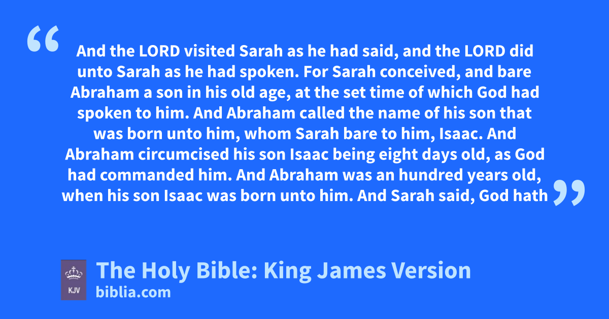 1 And the LORD visited Sarah as he had said, and the LORD did unto Sarah as he had spoken. 2 For Sarah conceived, and bare Abraham a son in his old age, at the set time of which God had spoken to him. 3 And Abraham called the name of his son that was born unto him, whom Sarah bare to him, Isaac. 4 And Abraham circumcised his son Isaac being eight days old, as God had commanded him. 5 And Abraham was an hundred years old, when his son Isaac was born unto him. 6 And Sarah said, God hath made me to laugh, so that all that hear will laugh with me. 7 And she said, Who would have said unto Abraham, that Sarah should have given children suck? for I have born him a son in his old age. 8 And the child grew, and was weaned: and Abraham made a great feast the same day that Isaac was weaned.