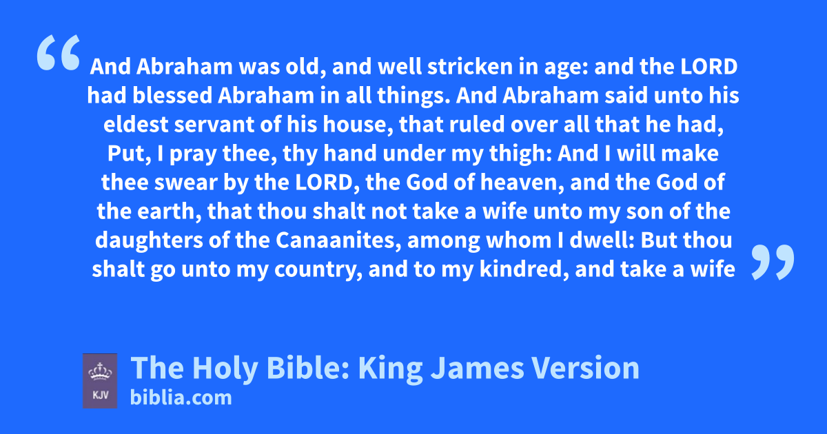 1 And Abraham was old, and well stricken in age: and the LORD had blessed Abraham in all things. 2 And Abraham said unto his eldest servant of his house, that ruled over all that he had, Put, I pray thee, thy hand under my thigh: 3 And I will make thee swear by the LORD, the God of heaven, and the God of the earth, that thou shalt not take a wife unto my son of the daughters of the Canaanites, among whom I dwell: 4 But thou shalt go unto my country, and to my kindred, and take a wife unto my son Isaac. 5 And the servant said unto him, Peradventure the woman will not be willing to follow me unto this land: must I needs bring thy son again unto the land from whence thou camest? 6 And Abraham said unto him, Beware thou that thou bring not my son thither again. 7 The LORD God of heaven, which took me from my father’s house, and from the land of my kindred, and which spake unto me, and that sware unto me, saying, Unto thy seed will I give this land; he shall send his angel before thee, and thou shalt take a wife unto my son from thence. 8 And if the woman will not be willing to follow thee, then thou shalt be clear from this my oath: only bring not my son thither again. 9 And the servant put his hand under the thigh of Abraham his master, and sware to him concerning that matter.