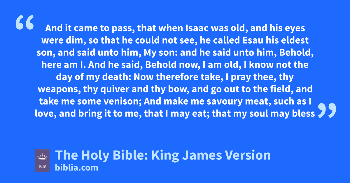 1 And it came to pass, that when Isaac was old, and his eyes were dim, so that he could not see, he called Esau his eldest son, and said unto him, My son: and he said unto him, Behold, here am I. 2 And he said, Behold now, I am old, I know not the day of my death: 3 Now therefore take, I pray thee, thy weapons, thy quiver and thy bow, and go out to the field, and takea me some venison; 4 And make me savoury meat, such as I love, and bring it to me, that I may eat; that my soul may bless thee before I die. 5 And Rebekah heard when Isaac spake to Esau his son. And Esau went to the field to hunt for venison, and to bring it.