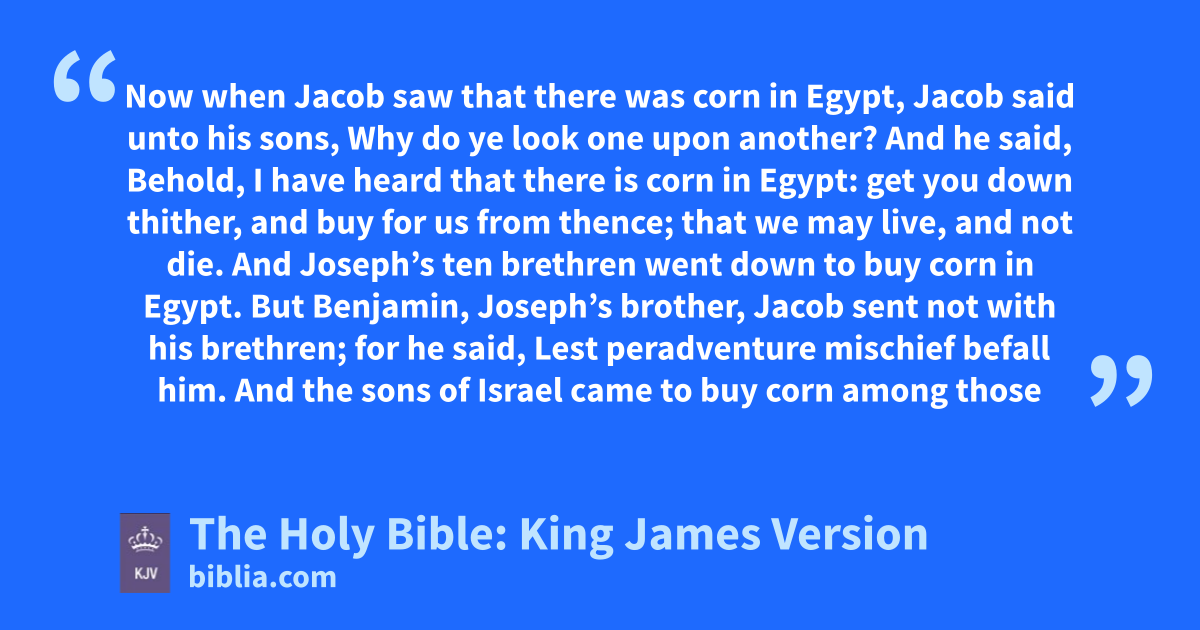 1 Now when Jacob saw that there was corn in Egypt, Jacob said unto his sons, Why do ye look one upon another? 2 And he said, Behold, I have heard that there is corn in Egypt: get you down thither, and buy for us from thence; that we may live, and not die. 3 And Joseph’s ten brethren went down to buy corn in Egypt. 4 But Benjamin, Joseph’s brother, Jacob sent not with his brethren; for he said, Lest peradventure mischief befall him. 5 And the sons of Israel came to buy corn among those that came: for the famine was in the land of Canaan. 6 And Joseph was the governor over the land, and he it was that sold to all the people of the land: and Joseph’s brethren came, and bowed down themselves before him with their faces to the earth.