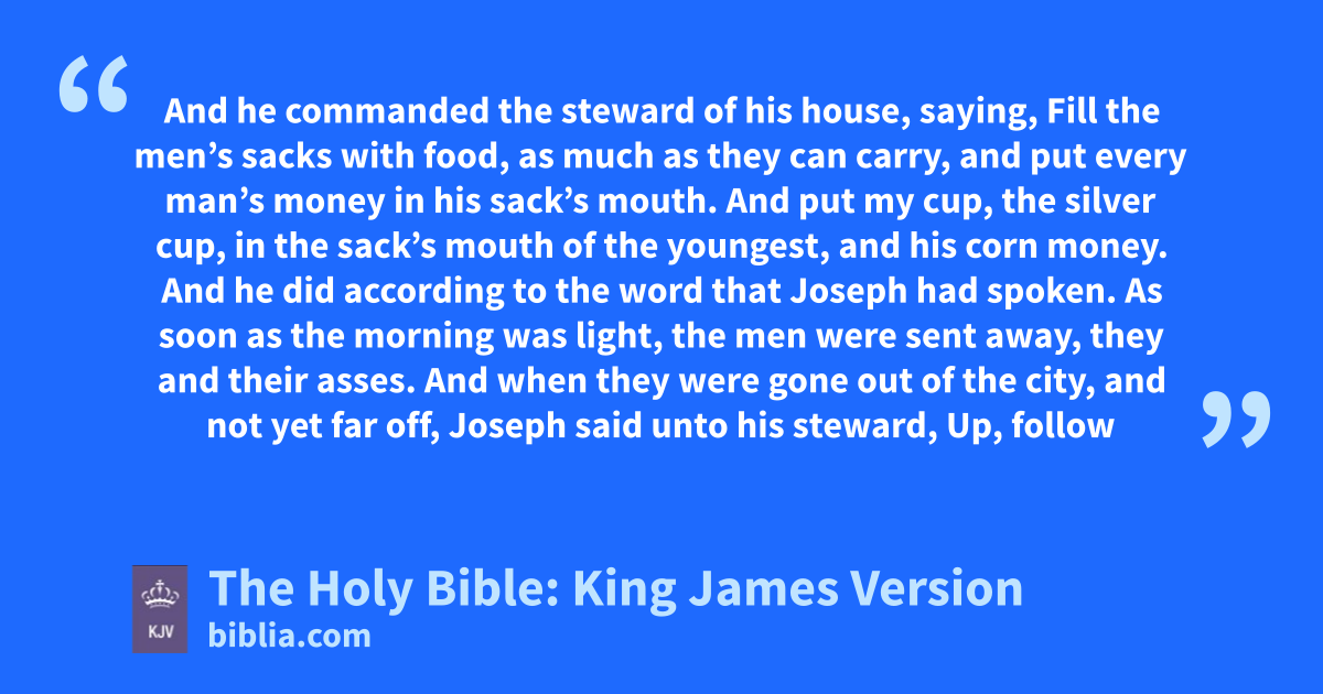 1 And he commanded the steward of his house, saying, Fill the men’s sacks with food, as much as they can carry, and put every man’s money in his sack’s mouth. 2 And put my cup, the silver cup, in the sack’s mouth of the youngest, and his corn money. And he did according to the word that Joseph had spoken. 3 As soon as the morning was light, the men were sent away, they and their asses. 4 And when they were gone out of the city, and not yet far off, Joseph said unto his steward, Up, follow after the men; and when thou dost overtake them, say unto them, Wherefore have ye rewarded evil for good? 5 Is not this it in which my lord drinketh, and whereby indeed he divinetha? ye have done evil in so doing. 6 And he overtook them, and he spake unto them these same words. 7 And they said unto him, Wherefore saith my lord these words? God forbid that thy servants should do according to this thing: 8 Behold, the money, which we found in our sacks’ mouths, we brought again unto thee out of the land of Canaan: how then should we steal out of thy lord’s house silver or gold? 9 With whomsoever of thy servants it be found, both let him die, and we also will be my lord’s bondmen. 10 And he said, Now also let it be according unto your words: he with whom it is found shall be my servant; and ye shall be blameless. 11 Then they speedily took down every man his sack to the ground, and opened every man his sack. 12 And he searched, and began at the eldest, and left at the youngest: and the cup was found in Benjamin’s sack. 13 Then they rent their clothes, and laded every man his ass, and returned to the city. 14 And Judah and his brethren came to Joseph’s house; for he was yet there: and they fell before him on the ground. 15 And Joseph said unto them, What deed is this that ye have done? wot ye not that such a man as I can certainly divineb? 16 And Judah said, What shall we say unto my lord? what shall we speak? or how shall we clear ourselves? God hath found out the iniquity of thy servants: behold, we are my lord’s servants, both we, and he also with whom the cup is found. 17 And he said, God forbid that I should do so: but the man in whose hand the cup is found, he shall be my servant; and as for you, get you up in peace unto your father.