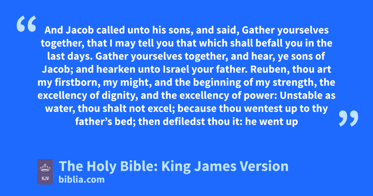1 And Jacob called unto his sons, and said, Gather yourselves together, that I may tell you that which shall befall you in the last days. 2 Gather yourselves together, and hear, ye sons of Jacob; and hearken unto Israel your father. 3 Reuben, thou art my firstborn, my might, and the beginning of my strength, the excellency of dignity, and the excellency of power: 4 Unstable as water, thou shalt not excel; because thou wentest up to thy father’s bed; then defiledst thou it: he went up to my couch.
