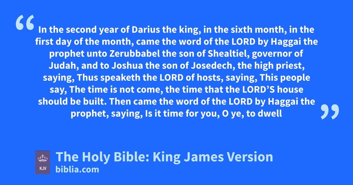 1 In the second year of Darius the king, in the sixth month, in the first day of the month, came the word of the LORD bya Haggai the prophet unto Zerubbabel the son of Shealtiel, governor of Judah, and to Joshua the son of Josedech, the high priest, saying, 2 Thus speaketh the LORD of hosts, saying, This people say, The time is not come, the time that the LORD’S house should be built. 3 Then came the word of the LORD by Haggai the prophet, saying, 4 Is it time for you, O ye, to dwell in your cieled houses, and this house lie waste? 5 Now therefore thus saith the LORD of hosts; Considerb your ways. 6 Ye have sown much, and bring in little; ye eat, but ye have not enough; ye drink, but ye are not filled with drink; ye clothe you, but there is none warm; and he that earneth wages earneth wages to put it into a bag with holesc. 7 Thus saith the LORD of hosts; Considerd your ways. 8 Go up to the mountain, and bring wood, and build the house; and I will take pleasure in it, and I will be glorified, saith the LORD. 9 Ye looked for much, and, lo, it came to little; and when ye brought it home, I did blowe upon it. Why? saith the LORD of hosts. Because of mine house that is waste, and ye run every man unto his own house. 10 Therefore the heaven over you is stayed from dew, and the earth is stayed from her fruit. 11 And I called for a drought upon the land, and upon the mountains, and upon the corn, and upon the new wine, and upon the oil, and upon that which the ground bringeth forth, and upon men, and upon cattle, and upon all the labour of the hands.
