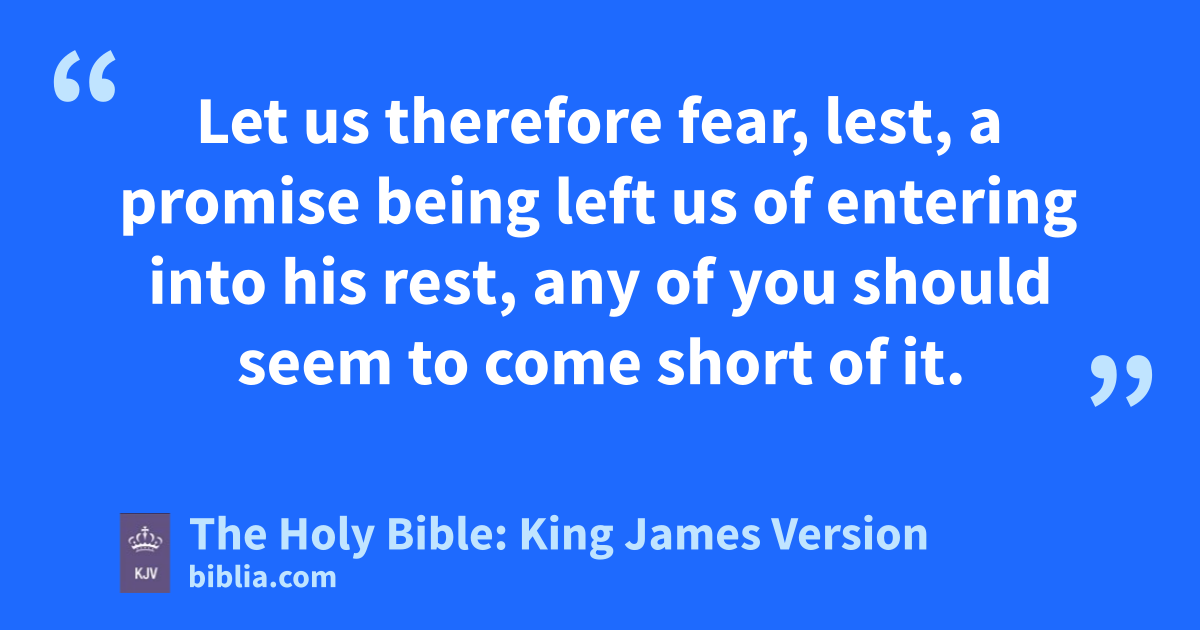 1 Let us therefore fear, lest, a promise being left us of entering into his rest, any of you should seem to come short of it. 2 For unto us was the gospel preached, as well as unto them: but the worda preached did not profit them, not being mixed with faith in them that heard it. 3 For we which have believed do enter into rest, as he said, As I have sworn in my wrath, if they shall enter into my rest: although the works were finished from the foundation of the world. 4 For he spake in a certain place of the seventh day on this wise, And God did rest the seventh day from all his works. 5 And in this place again, If they shall enter into my rest. 6 Seeing therefore it remaineth that some must enter therein, and they to whom it was first preached entered not in because of unbelief: 7 Again, he limiteth a certain day, saying in David, To day, after so long a time; as it is said, To day if ye will hear his voice, harden not your hearts. 8 For if Jesusb had given them rest, then would he not afterward have spoken of another day. 9 There remaineth therefore a restc to the people of God. 10 For he that is entered into his rest, he also hath ceased from his own works, as God did from his.