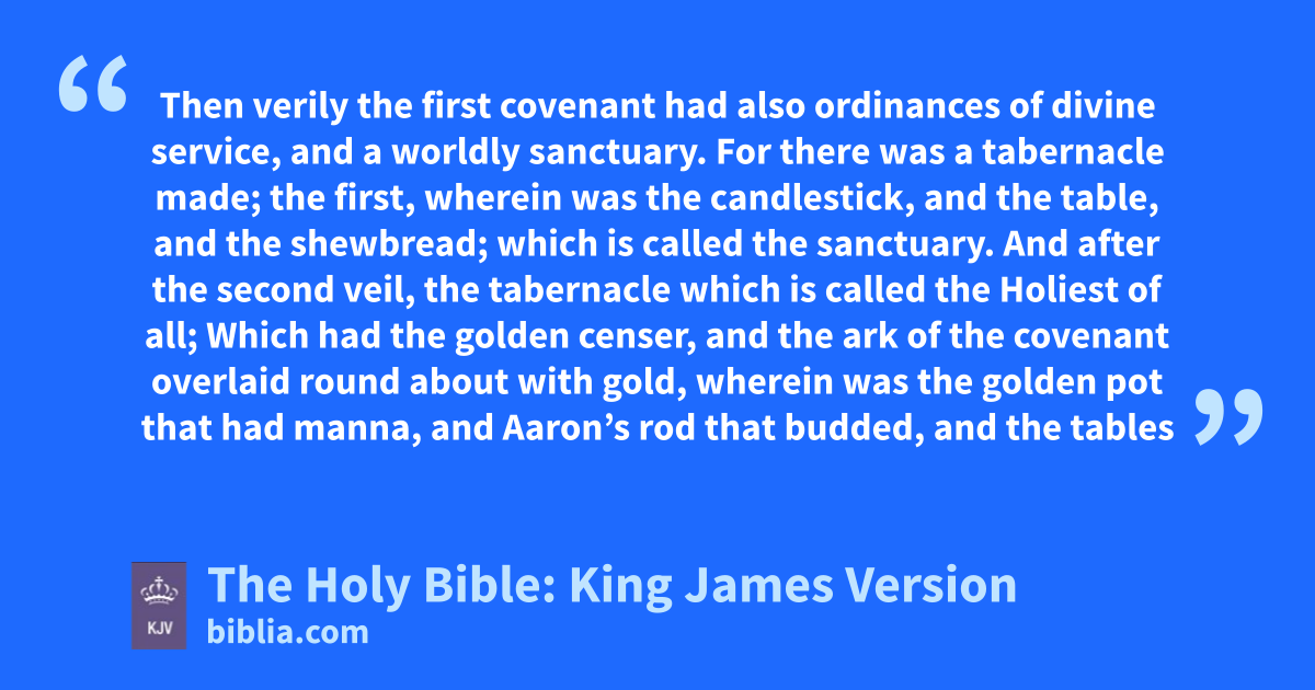 1 Then verily the first covenant had also ordinancesa of divine service, and a worldly sanctuary. 2 For there was a tabernacle made; the first, wherein was the candlestick, and the table, and the shewbread; which is called the sanctuaryb. 3 And after the second veil, the tabernacle which is called the Holiest of all; 4 Which had the golden censer, and the ark of the covenant overlaid round about with gold, wherein was the golden pot that had manna, and Aaron’s rod that budded, and the tables of the covenant; 5 And over it the cherubims of glory shadowing the mercyseat; of which we cannot now speak particularly. 6 Now when these things were thus ordained, the priests went always into the first tabernacle, accomplishing the service of God. 7 But into the second went the high priest alone once every year, not without blood, which he offered for himself, and for the errors of the people: