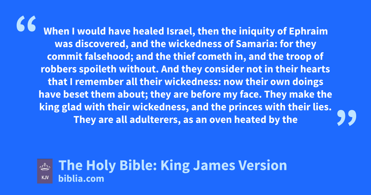 1 When I would have healed Israel, then the iniquity of Ephraim was discovered, and the wickednessa of Samaria: for they commit falsehood; and the thief cometh in, and the troop of robbers spoileth without. 2 And they considerb not in their hearts that I remember all their wickedness: now their own doings have beset them about; they are before my face. 3 They make the king glad with their wickedness, and the princes with their lies. 4 They are all adulterers, as an oven heated by the baker, who ceaseth from raising after he hath kneaded the dough, until it be leavened. 5 In the day of our king the princes have made him sick with bottlesc of wine; he stretched out his hand with scorners. 6 For they have made ready their heart like an oven, whiles they lie in wait: their baker sleepeth all the night; in the morning it burneth as a flaming fire. 7 They are all hot as an oven, and have devoured their judges; all their kings are fallen: there is none among them that calleth unto me.