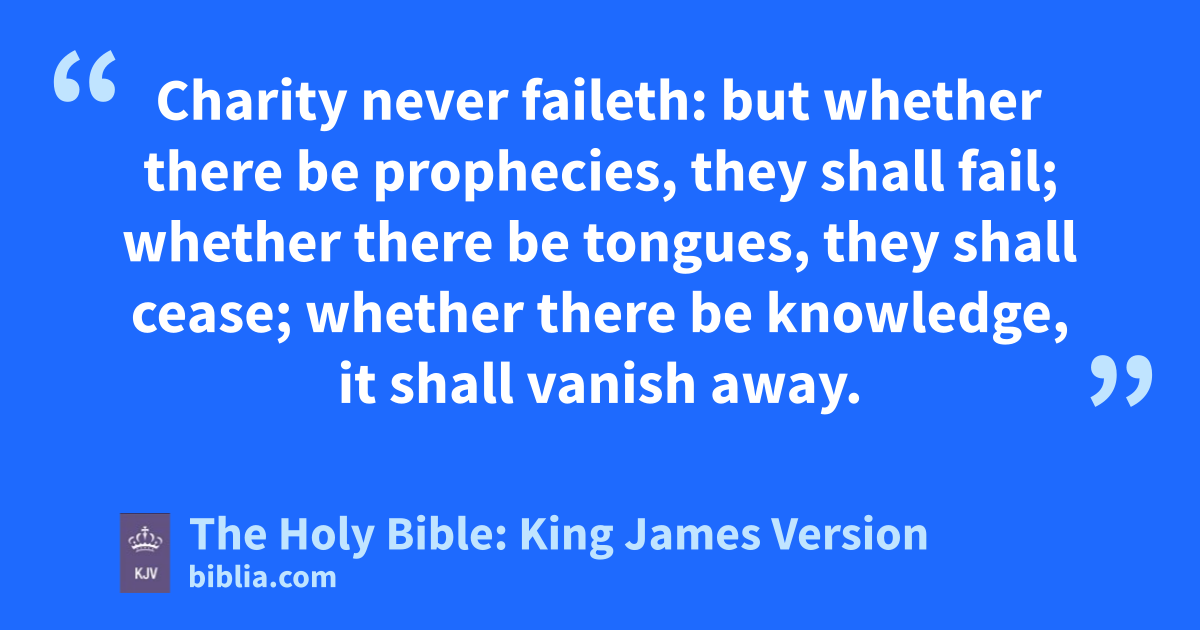 8 Charity never faileth: but whether there be prophecies, they shall failc; whether there be tongues, they shall cease; whether there be knowledge, it shall vanish away. 9 For we know in part, and we prophesy in part. 10 But when that which is perfect is come, then that which is in part shall be done awayd. 11 When I was a child, I spake as a child, I understood as a child, I thoughte as a child: but when I became a man, I put away childish things. 12 For now we see through a glass, darklyf; but then face to face: now I know in part; but then shall I know even as also I am known. 13 And now abideth faith, hope, charity, these three; but the greatest of these is charity.
