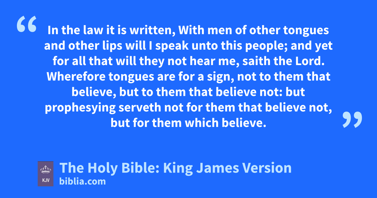 21 In the law it is written, With men of other tongues and other lips will I speak unto this people; and yet for all that will they not hear me, saith the Lord. 22 Wherefore tongues are for a sign, not to them that believe, but to them that believe not: but prophesying serveth not for them that believe not, but for them which believe. 23 If therefore the whole church be come together into one place, and all speak with tongues, and there come in those that are unlearned, or unbelievers, will they not say that ye are mad? 24 But if all prophesy, and there come in one that believeth not, or one unlearned, he is convinced of all, he is judged of all: 25 And thus are the secrets of his heart made manifest; and so falling down on his face he will worship God, and report that God is in you of a truth.