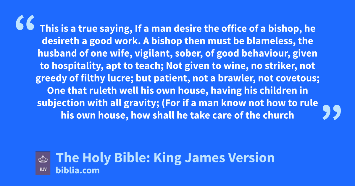 1 This is a true saying, If a man desire the office of a bishop, he desireth a good work. 2 A bishop then must be blameless, the husband of one wife, vigilant, sober, of good behaviour, given to hospitality, apt to teach; 3 Not given to wine, no striker, not greedy of filthy lucre; but patient, not a brawler, not covetous; 4 One that ruleth well his own house, having his children in subjection with all gravity; 5 (For if a man know not how to rule his own house, how shall he take care of the church of God?) 6 Not a novicea, lest being lifted up with pride he fall into the condemnation of the devil. 7 Moreover he must have a good report of them which are without; lest he fall into reproach and the snare of the devil.