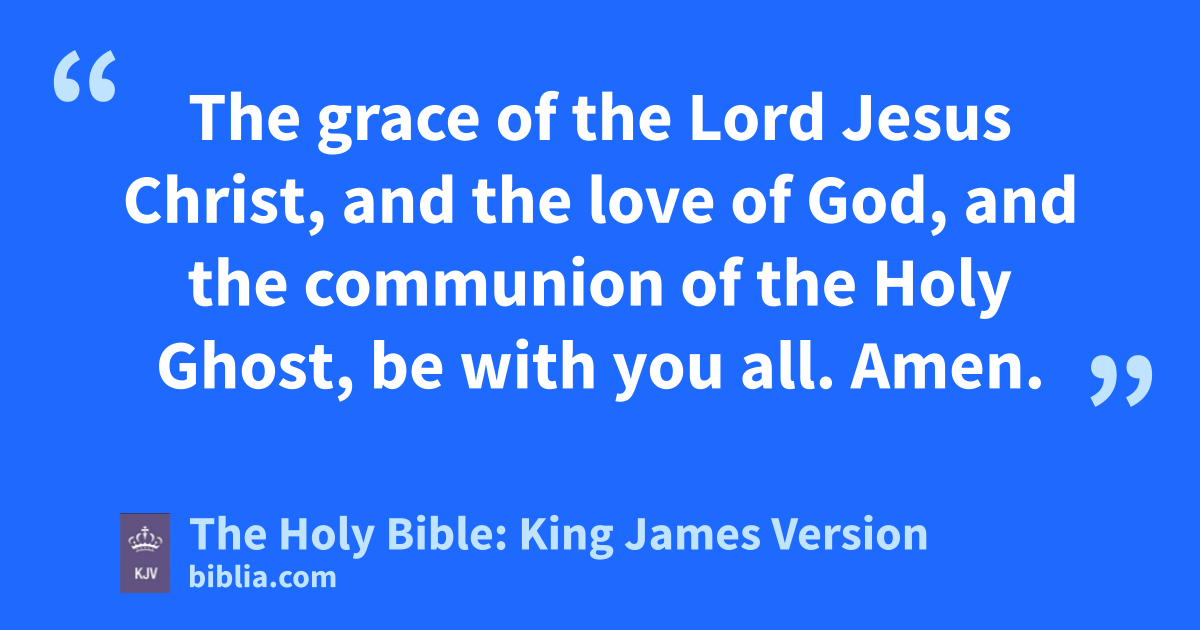 11 Finally, brethren, farewell. Be perfect, be of good comfort, be of one mind, live in peace; and the God of love and peace shall be with you. 12 Greet one another with an holy kiss. 13 All the saints salute you. 14 The grace of the Lord Jesus Christ, and the love of God, and the communion of the Holy Ghost, be with you all. Amen.