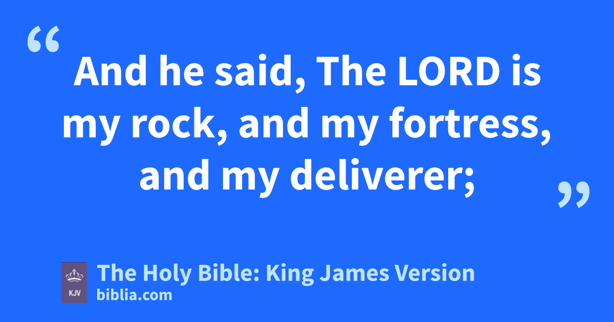 2 And he said, The LORD is my rock, and my fortress, and my deliverer; 3 The God of my rock; in him will I trust: he is my shield, and the horn of my salvation, my high tower, and my refuge, my saviour; thou savest me from violence. 4 I will call on the LORD, who is worthy to be praised: so shall I be saved from mine enemies. 5 When the wavesa of death compassed me, the floods of ungodly men made me afraid; 6 The sorrowsb of hell compassed me about; the snares of death prevented me; 7 In my distress I called upon the LORD, and cried to my God: and he did hear my voice out of his temple, and my cry did enter into his ears. 8 Then the earth shook and trembled; the foundations of heaven moved and shook, because he was wroth. 9 There went up a smoke out of his nostrilsc, and fire out of his mouth devoured: coals were kindled by it. 10 He bowed the heavens also, and came down; and darkness was under his feet. 11 And he rode upon a cherub, and did fly: and he was seen upon the wings of the wind. 12 And he made darkness pavilions round about him, darkd waters, and thick clouds of the skies. 13 Through the brightness before him were coals of fire kindled. 14 The LORD thundered from heaven, and the most High uttered his voice. 15 And he sent out arrows, and scattered them; lightning, and discomfited them. 16 And the channels of the sea appeared, the foundations of the world were discovered, at the rebuking of the LORD, at the blast of the breath of his nostrils. 17 He sent from above, he took me; he drew me out of manye waters; 18 He delivered me from my strong enemy, and from them that hated me: for they were too strong for me. 19 They prevented me in the day of my calamity: but the LORD was my stay. 20 He brought me forth also into a large place: he delivered me, because he delighted in me. 21 The LORD rewarded me according to my righteousness: according to the cleanness of my hands hath he recompensed me. 22 For I have kept the ways of the LORD, and have not wickedly departed from my God. 23 For all his judgments were before me: and as for his statutes, I did not depart from them. 24 I was also upright before him, and have kept myself from mine iniquity. 25 Therefore the LORD hath recompensed me according to my righteousness; according to my cleanness in his eye sight. 26 With the merciful thou wilt shew thyself merciful, and with the upright man thou wilt shew thyself upright. 27 With the pure thou wilt shew thyself pure; and with the froward thou wilt shew thyself unsavouryf. 28 And the afflicted people thou wilt save: but thine eyes are upon the haughty, that thou mayest bring them down. 29 For thou art my lampg, O LORD: and the LORD will lighten my darkness. 30 For by thee I have runh through a troop: by my God have I leaped over a wall. 31 As for God, his way is perfect; the word of the LORD is triedi: he is a buckler to all them that trust in him. 32 For who is God, save the LORD? and who is a rock, save our God? 33 God is my strength and power: and he makethj my way perfect. 34 He makethk my feet like hinds’ feet: and setteth me upon my high places. 35 He teacheth my hands to warl; so that a bow of steel is broken by mine arms. 36 Thou hast also given me the shield of thy salvation: and thy gentleness hath made me great. 37 Thou hast enlarged my steps under me; so that my feetm did not slip. 38 I have pursued mine enemies, and destroyed them; and turned not again until I had consumed them. 39 And I have consumed them, and wounded them, that they could not arise: yea, they are fallen under my feet. 40 For thou hast girded me with strength to battle: them that rose up against me hast thou subduedn under me. 41 Thou hast also given me the necks of mine enemies, that I might destroy them that hate me. 42 They looked, but there was none to save; even unto the LORD, but he answered them not. 43 Then did I beat them as small as the dust of the earth, I did stamp them as the mire of the street, and did spread them abroad. 44 Thou also hast delivered me from the strivings of my people, thou hast kept me to be head of the heathen: a people which I knew not shall serve me. 45 Strangerso shall submit themselves unto me: as soon as they hear, they shall be obedient unto me. 46 Strangers shall fade away, and they shall be afraid out of their close places. 47 The LORD liveth; and blessed be my rock; and exalted be the God of the rock of my salvation. 48 It is God that avengethp me, and that bringeth down the people under me, 49 And that bringeth me forth from mine enemies: thou also hast lifted me up on high above them that rose up against me: thou hast delivered me from the violent man. 50 Therefore I will give thanks unto thee, O LORD, among the heathen, and I will sing praises unto thy name. 51 He is the tower of salvation for his king: and sheweth mercy to his anointed, unto David, and to his seed for evermore.