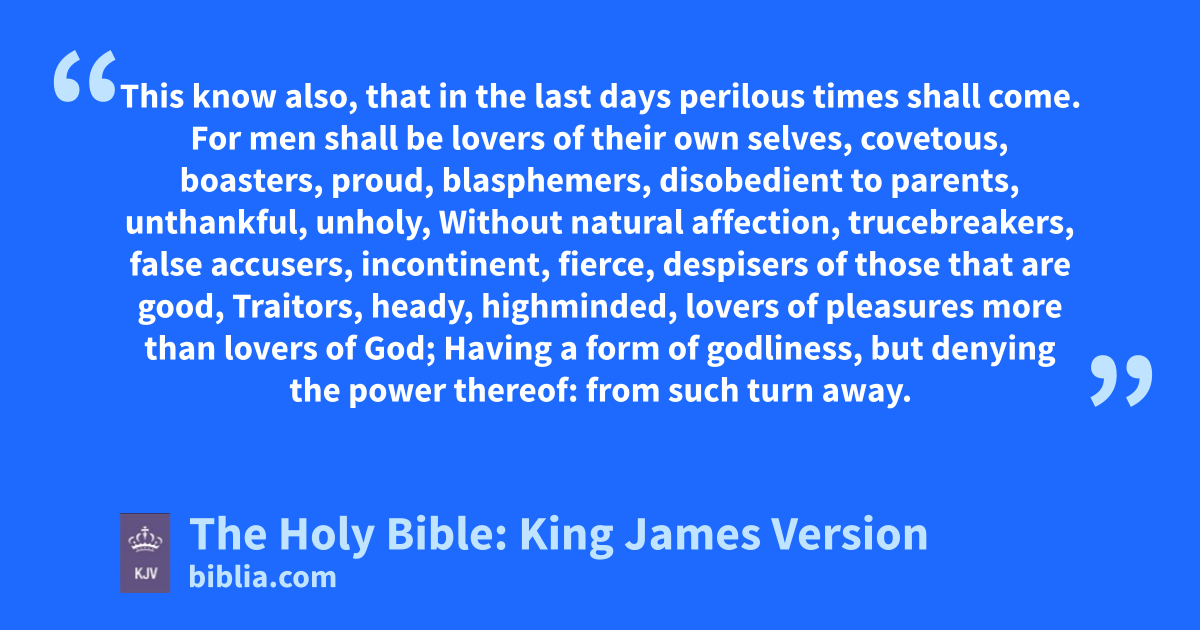 1 This know also, that in the last days perilous times shall come. 2 For men shall be lovers of their own selves, covetous, boasters, proud, blasphemers, disobedient to parents, unthankful, unholy, 3 Without natural affection, trucebreakers, false accusers, incontinent, fierce, despisers of those that are good, 4 Traitors, heady, highminded, lovers of pleasures more than lovers of God; 5 Having a form of godliness, but denying the power thereof: from such turn away. 6 For of this sort are they which creep into houses, and lead captive silly women laden with sins, led away with divers lusts, 7 Ever learning, and never able to come to the knowledge of the truth. 8 Now as Jannes and Jambres withstood Moses, so do these also resist the truth: men of corrupt minds, reprobatea concerning the faith. 9 But they shall proceed no further: for their folly shall be manifest unto all men, as theirs also was.