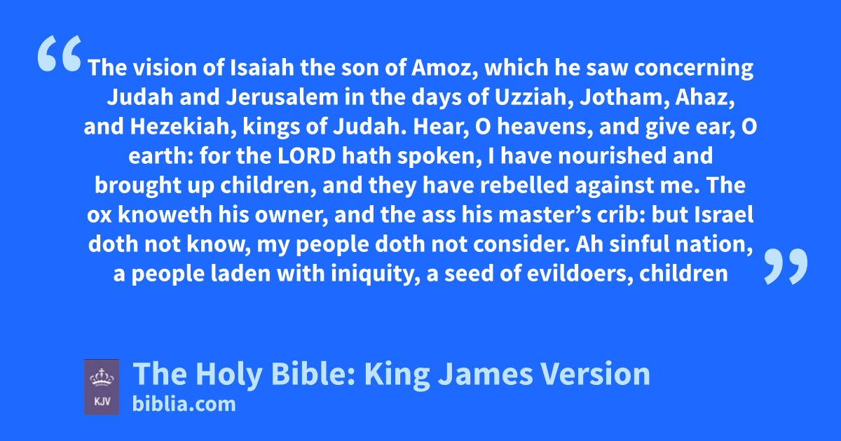 2 Hear, O heavens, and give ear, O earth: for the LORD hath spoken, I have nourished and brought up children, and they have rebelled against me. 3 The ox knoweth his owner, and the ass his master’s crib: but Israel doth not know, my people doth not consider. 4 Ah sinful nation, a people ladena with iniquity, a seed of evildoers, children that are corrupters: they have forsaken the LORD, they have provoked the Holy One of Israel unto anger, they are gone away backward. 5 Why should ye be stricken any more? ye will revoltb more and more: the whole head is sick, and the whole heart faint. 6 From the sole of the foot even unto the head there is no soundness in it; but wounds, and bruises, and putrifying sores: they have not been closed, neither bound up, neither mollified with ointmentc. 7 Your country is desolate, your cities are burned with fire: your land, strangers devour it in your presence, and it is desolate, as overthrownd by strangers. 8 And the daughter of Zion is left as a cottage in a vineyard, as a lodge in a garden of cucumbers, as a besieged city. 9 Except the LORD of hosts had left unto us a very small remnant, we should have been as Sodom, and we should have been like unto Gomorrah.
