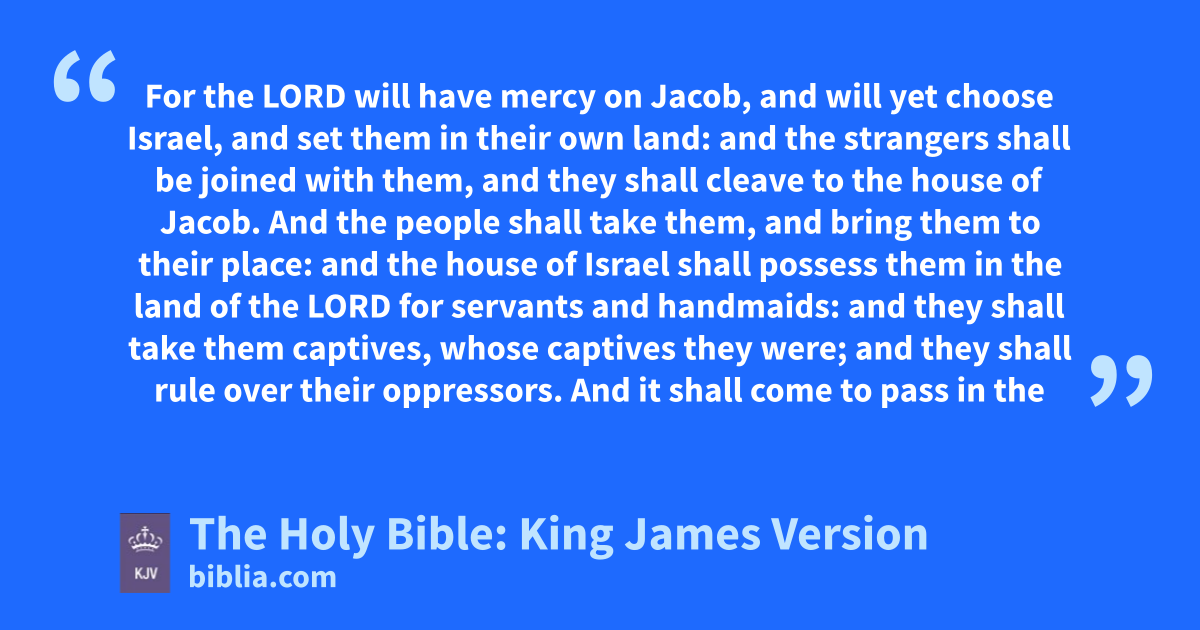 1 For the LORD will have mercy on Jacob, and will yet choose Israel, and set them in their own land: and the strangers shall be joined with them, and they shall cleave to the house of Jacob. 2 And the people shall take them, and bring them to their place: and the house of Israel shall possess them in the land of the LORD for servants and handmaids: and they shall take them captives, whose captives they were; and they shall rule over their oppressors. 3 And it shall come to pass in the day that the LORD shall give thee rest from thy sorrow, and from thy fear, and from the hard bondage wherein thou wast made to serve,