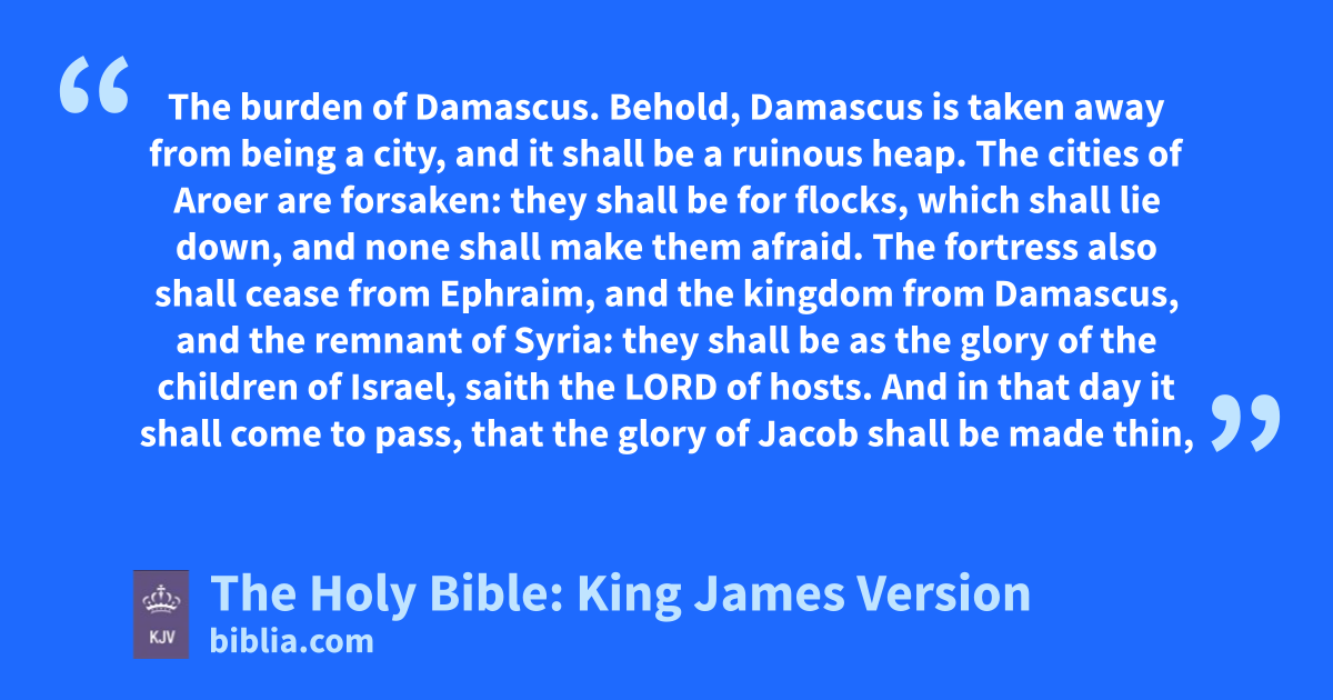 1 The burden of Damascus. Behold, Damascus is taken away from being a city, and it shall be a ruinous heap. 2 The cities of Aroer are forsaken: they shall be for flocks, which shall lie down, and none shall make them afraid. 3 The fortress also shall cease from Ephraim, and the kingdom from Damascus, and the remnant of Syria: they shall be as the glory of the children of Israel, saith the LORD of hosts. 4 And in that day it shall come to pass, that the glory of Jacob shall be made thin, and the fatness of his flesh shall wax lean. 5 And it shall be as when the harvestman gathereth the corn, and reapeth the ears with his arm; and it shall be as he that gathereth ears in the valley of Rephaim.